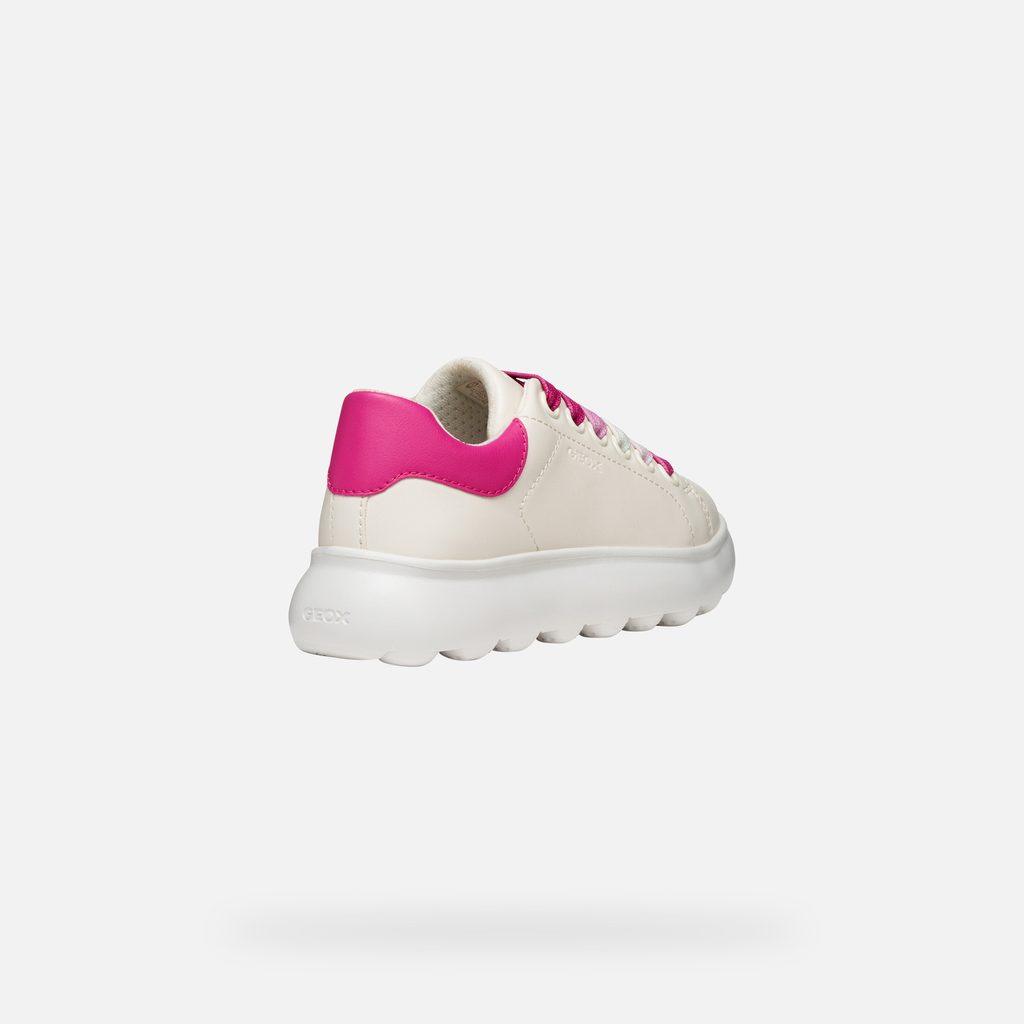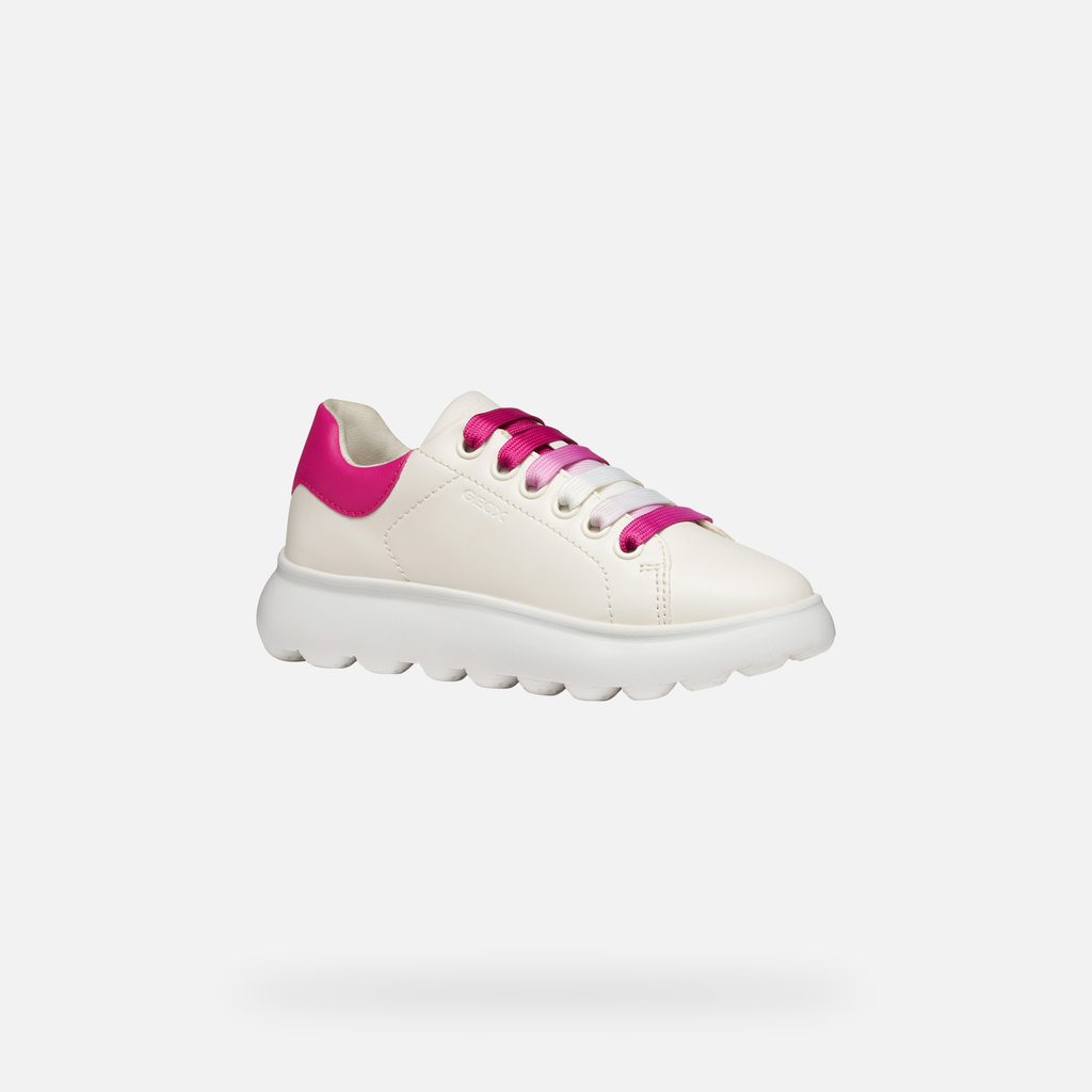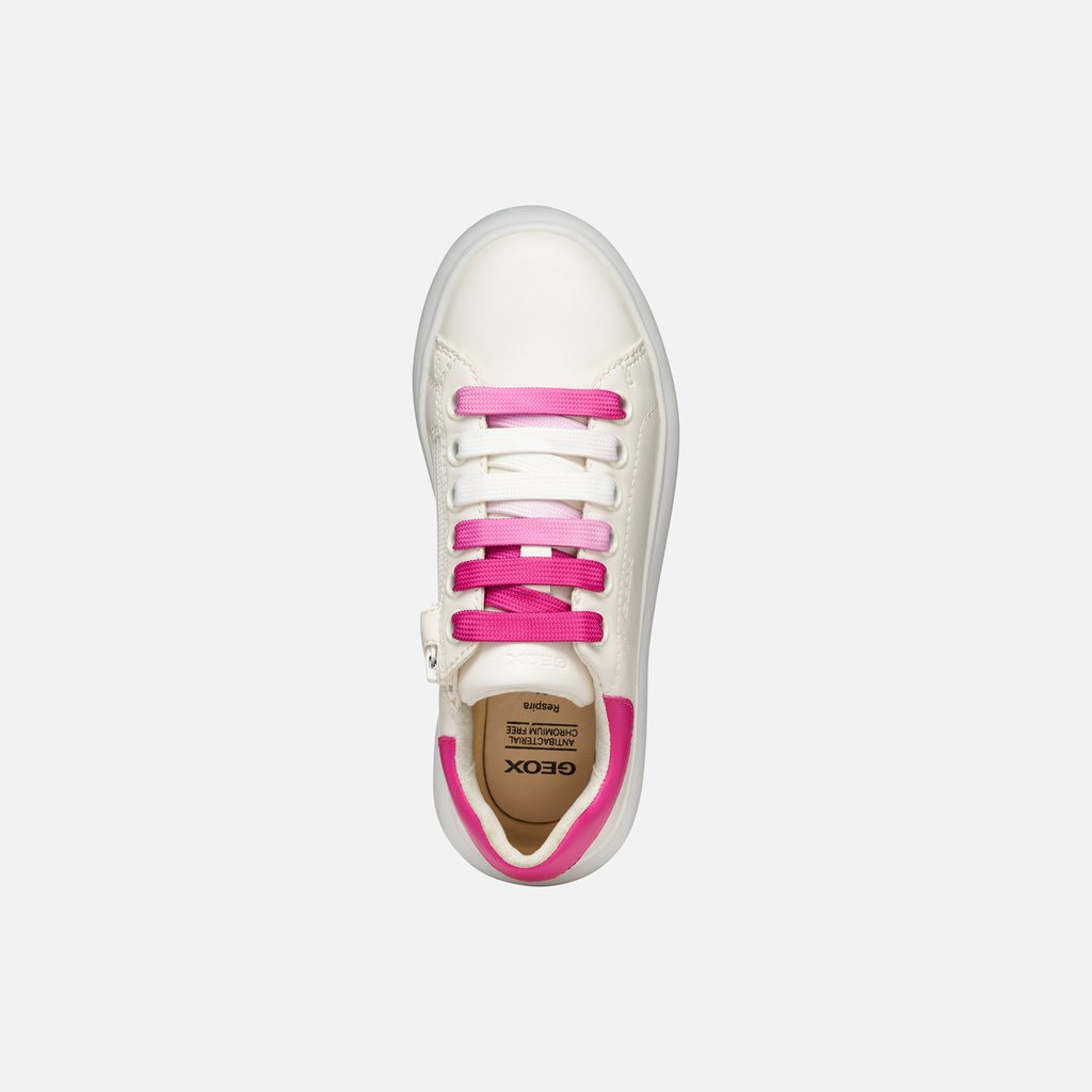 Bílé dívčí tenisky Geox Puffypop s výraznými růžovými detaily pro každodenní nošení.