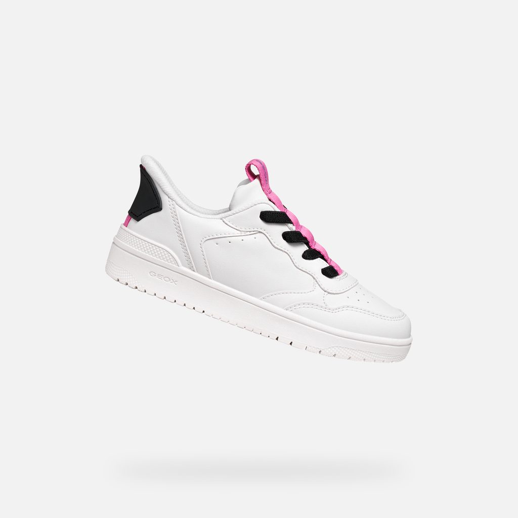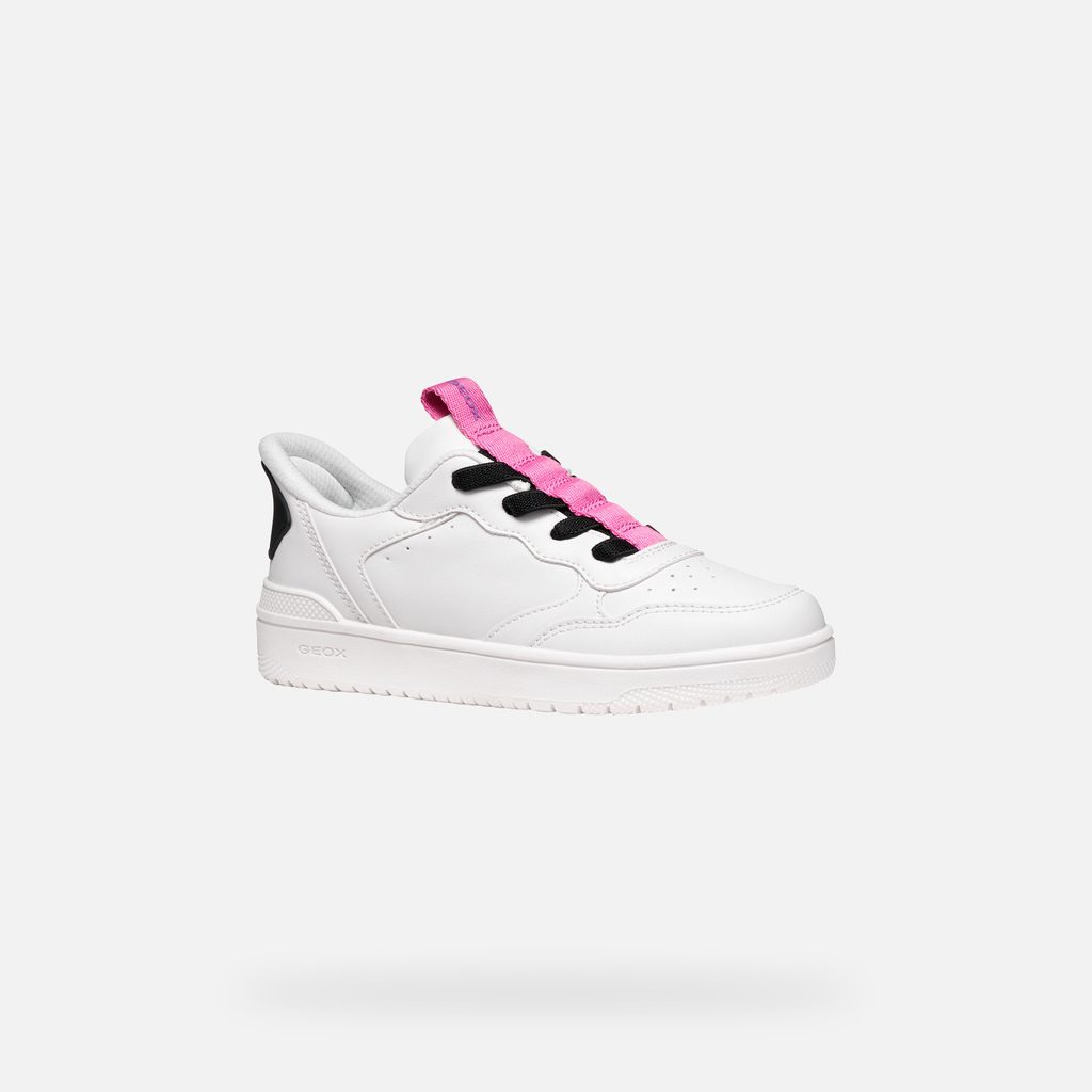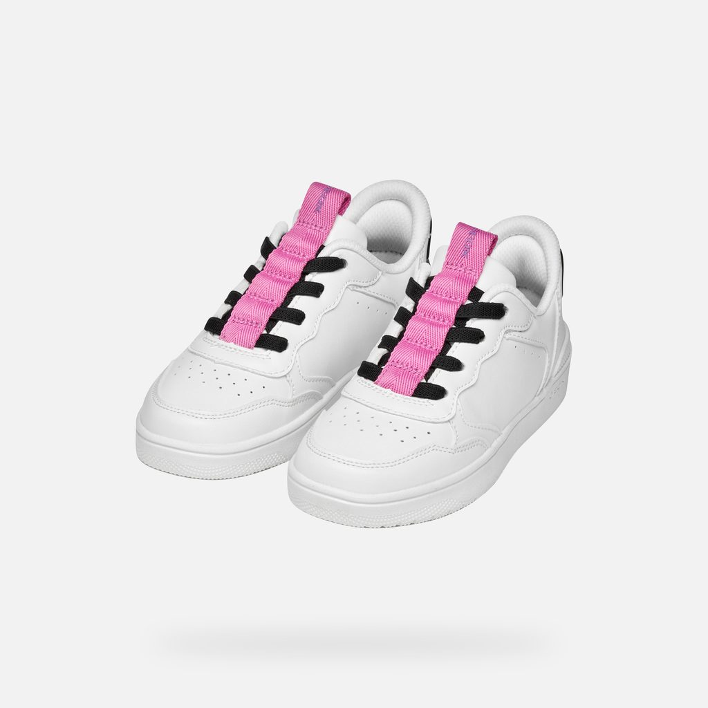 Bílé dívčí tenisky Geox Washiba Fast In s černými tkaničkami a růžovými akcenty.