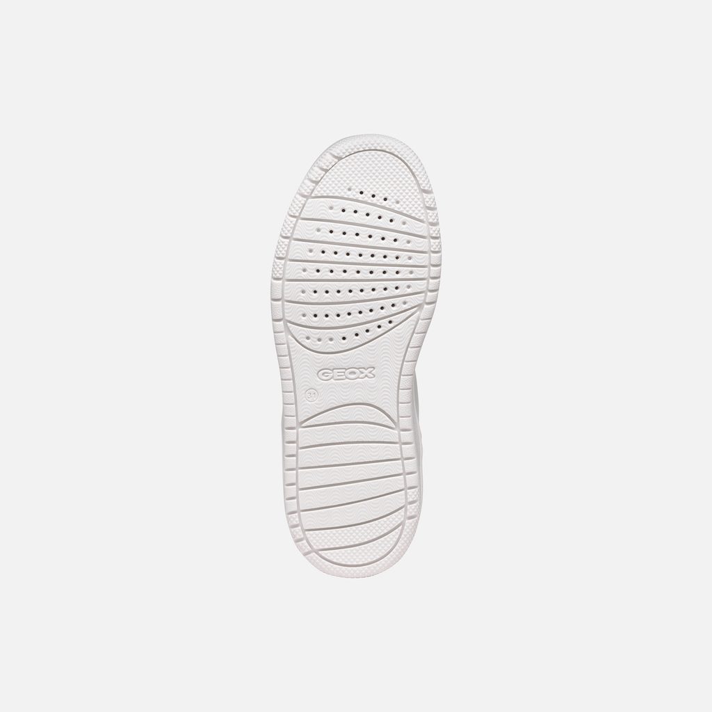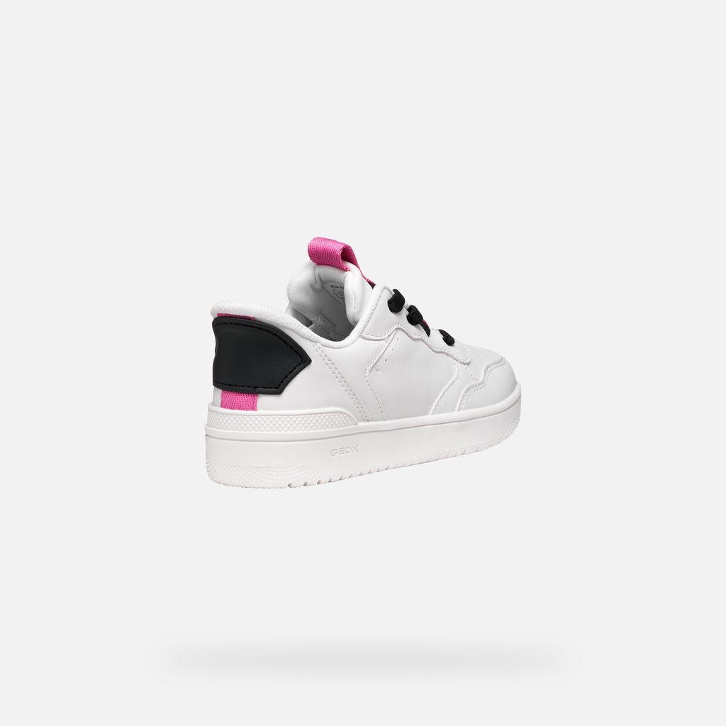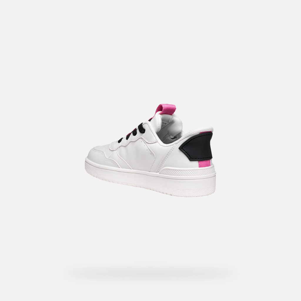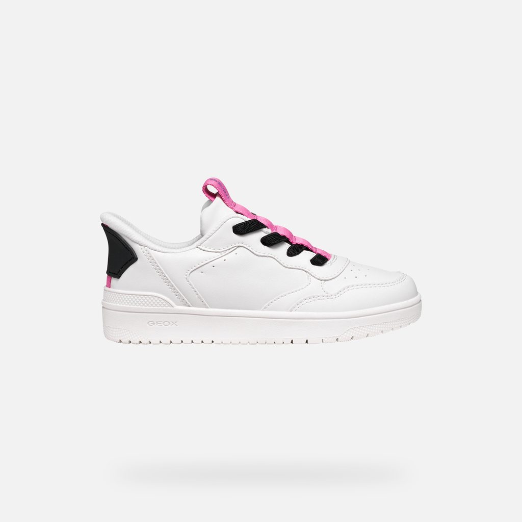 Bílé dívčí tenisky Geox Washiba Fast In s černými tkaničkami a růžovými akcenty.