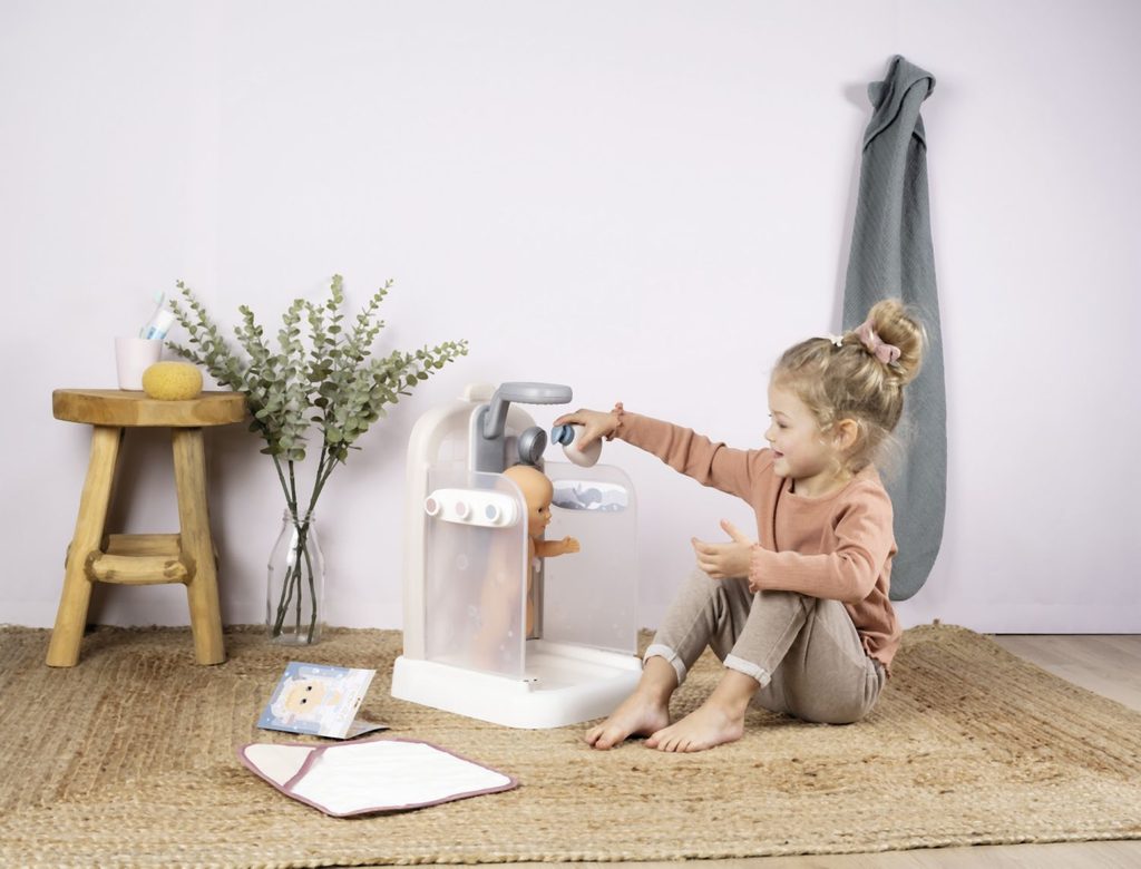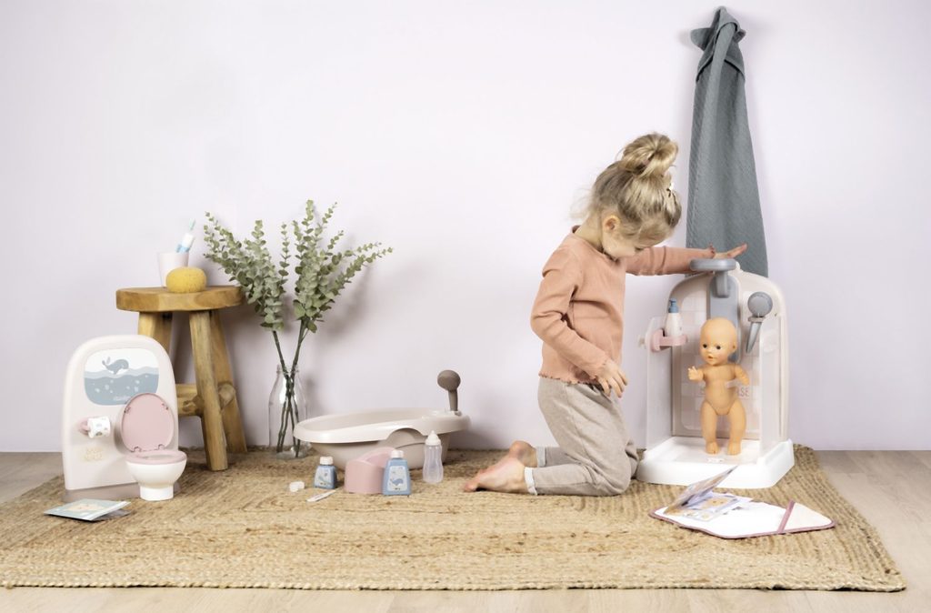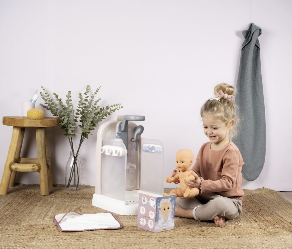 Sprchový kout pro panenky Baby Nurse s funkční sprchovou hlavicí, funkce proudu vody díky čerpadlu a nádrži na vodu. Sprcha má držák na ručník, háčky na župany, poličku, pevnou sprchu, hlavici a řada…