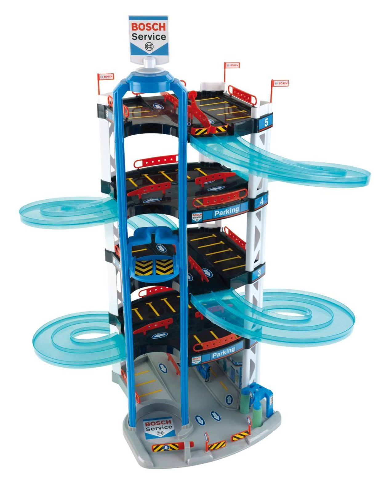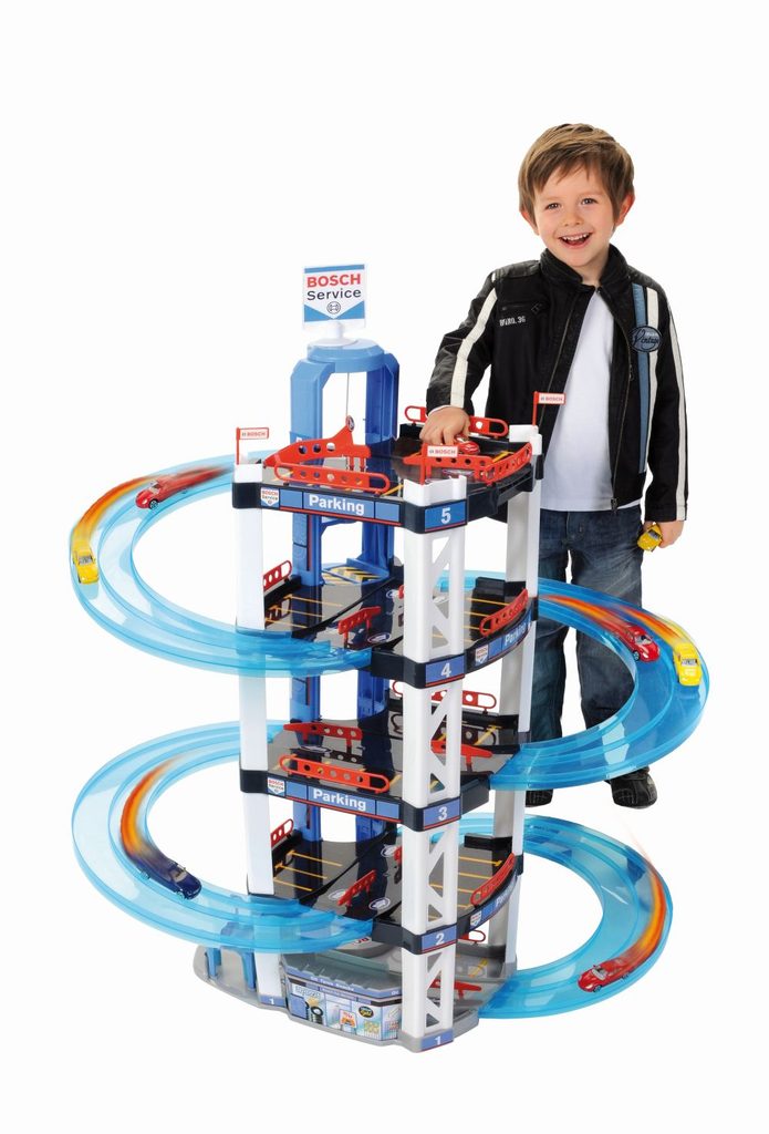 Garáž Bosch, 5 pater. Moderní garáž s čerpací stanicí a myčkou. Z horní části mohou autíčka závodit, kdo dojede dolu dřív. Včetně dvou autíček, Výška 85 cm. Vhodné pro děti od 3 let.