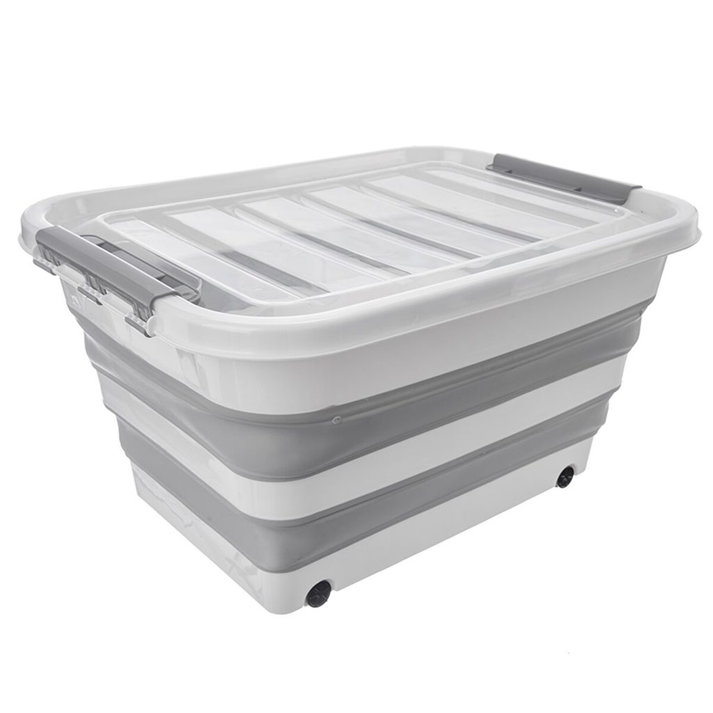 Skládací úložný box s víkem s kolečky je vhodný pro úklid lůžkovin, hraček, oblečení a čehokoli kdekoli v domácnosti, karavanu, kempu, v autě... Díky jeho mobilitě jej lehce přesunete, využijete volný prostor. Klipy na pevné uzavření. Ve složeném stavu zabere jen minimum místa. Materiál: plast PP + silikon TPE. Rozměry: objem 30 l, 54x39x28 cm, v. složeného boxu 9,5 cm.
