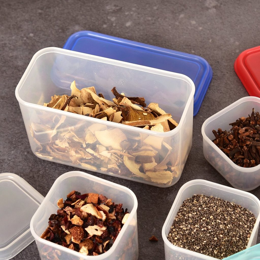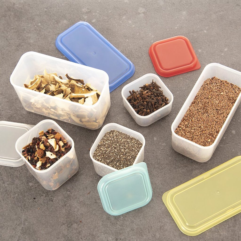 Box mini s víčkem. Materiál: plast. Barevný assort víček. Rozměry: objem 0,5 l, 14x7x8 cm.