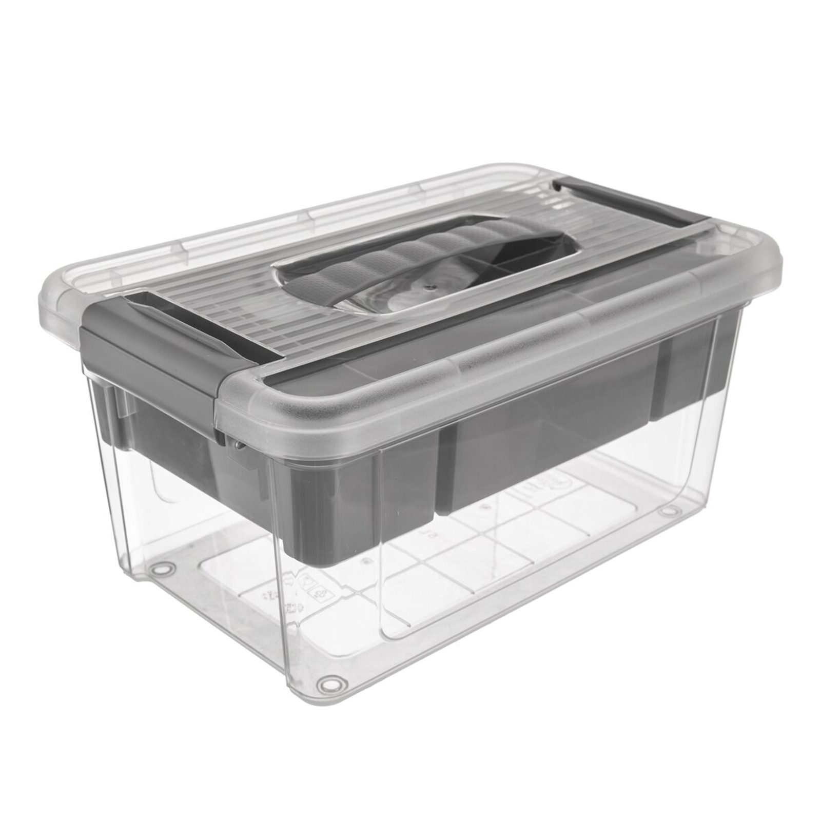 Box obdélníkový transparentní s víčkem na dva pevné klipy. Stohovatelný. Uvnitř vyjímatelný vklad s přihrádkami. Skvělé využití v domácnosti, v dílně, na šití, kosmetiku, v nemocnicích a zdravotních střediscích, domovech důchodců. Materiál: plast PP. Rozměry: objem 9 l, 35x23x17 cm. Vhodný do myčky.