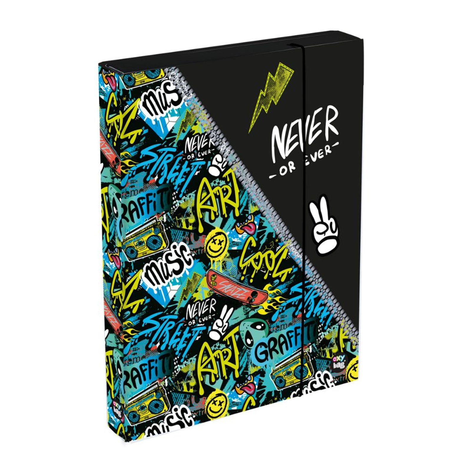 Oblíbený box na sešity JUMBO ve formátu A4. Nezbytná součást vybavení každého školáka na uložení sešitů, papírů a dalších školních pomůcek. Odolný materiál - lamino, chrání proti poškození. Zavírání na gumičku. Šířka hřbetu 4,5 cm.