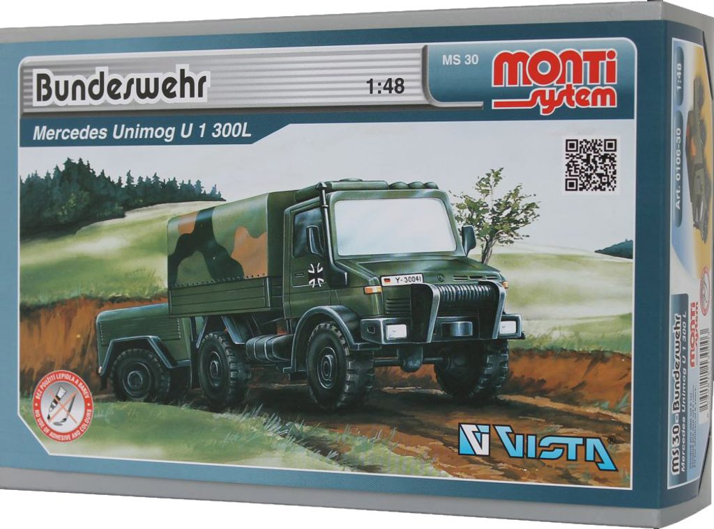 Model Mercedes Unimog MS 30 Bundeswehr 1:48 vojenské vozidlo německé armády s malým přívěsem.Stavebnice patří do skupiny Standard.