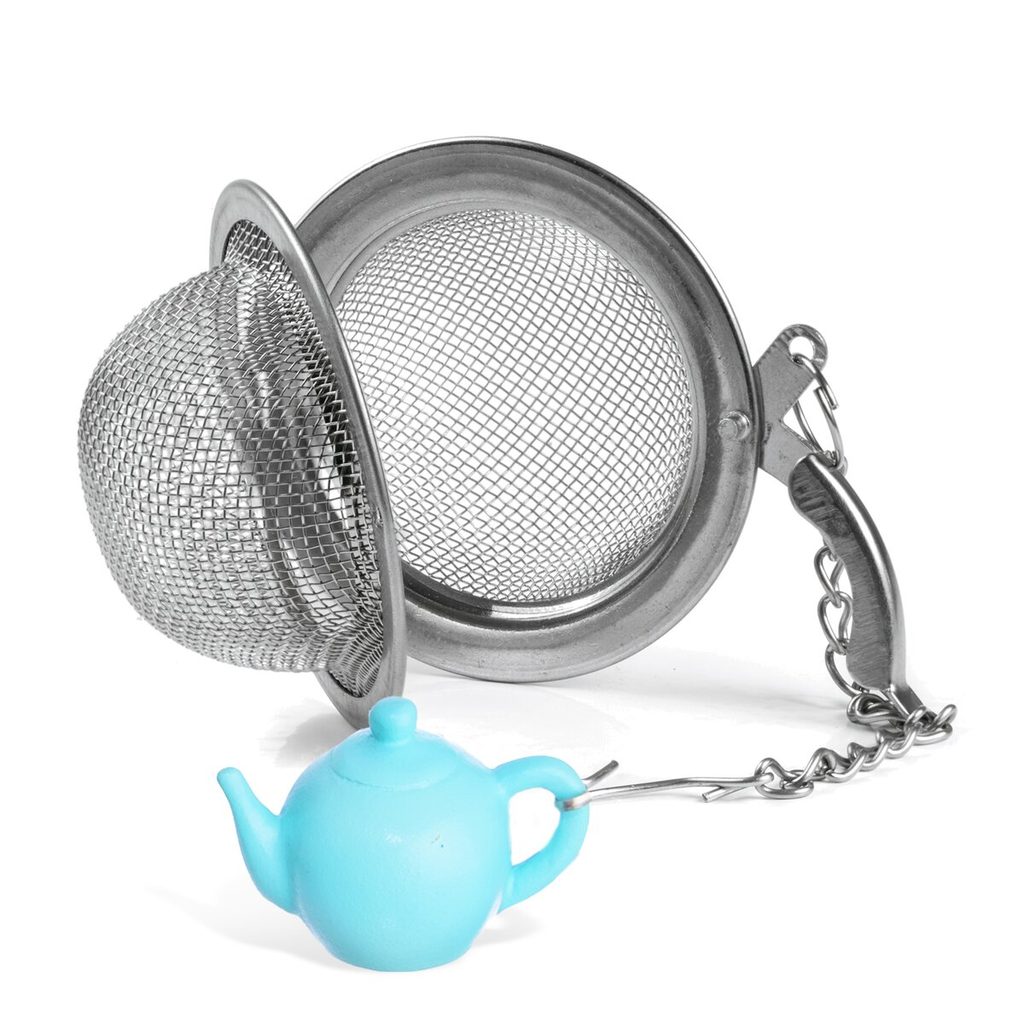 Čajítko na sypané čaje a bylinkové směsi s klipem a závěsem s těžítkem ve tvaru konvičky. Materiál: nerez, konvička z pryskyřice – slouží pouze jako těžítko. Rozměry: průměr 5 cm.