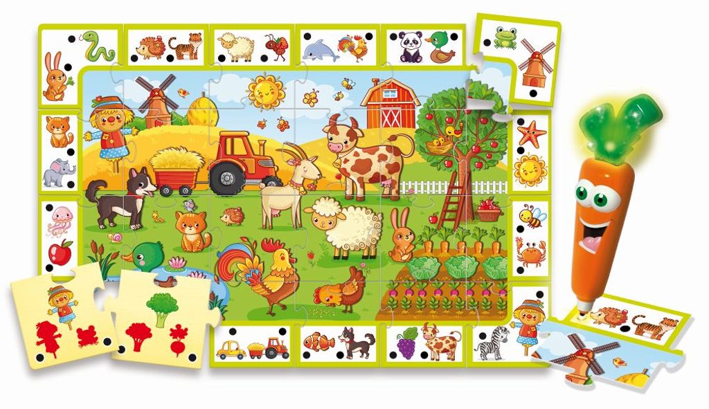 Carotina miluje přírodu a pobyt na venkově! Sestavte obrázek z oboustranných dílků a poznávejte hospodářské zvířata pomocí jednoduchých a zábavných kvízů. K odpovědi použijte mluvící tužku v podobě mrkvičky. Vhodné pro děti od 3 let.