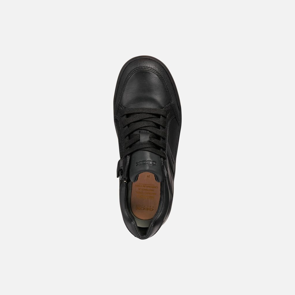 Černé chlapecké tenisky Geox Arzach zaujmou svým elegantním designem s čistými liniemi. Tenisky se vyznačují propracovanými detaily včetně viditelného prošívání a panelů, které jsou doplněny o decentní značkové logo na jazyku a na boku boty.