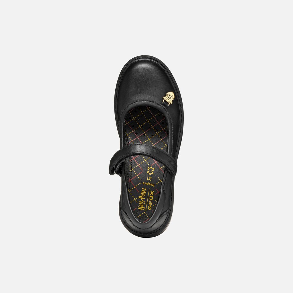 Černé dívčí baleríny Geox Casey inspirované světem Harry Pottera s elegantním páskem a zlatým erbem Bradavic na špičce.