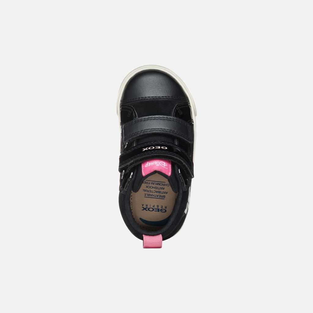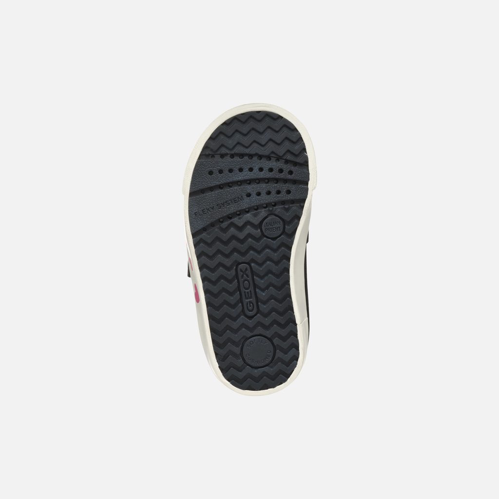 Stylové dětské tenisky Geox Kilwi s oblíbenou postavičkou Disney. Černé provedení zdobí roztomilá Minnie Mouse s charakteristickou růžovou mašlí, doplněná růžovým nápisem. Bílá podrážka s růžovými srdíčky a dva praktické suché zipy zajišťují pohodlné obouvání.