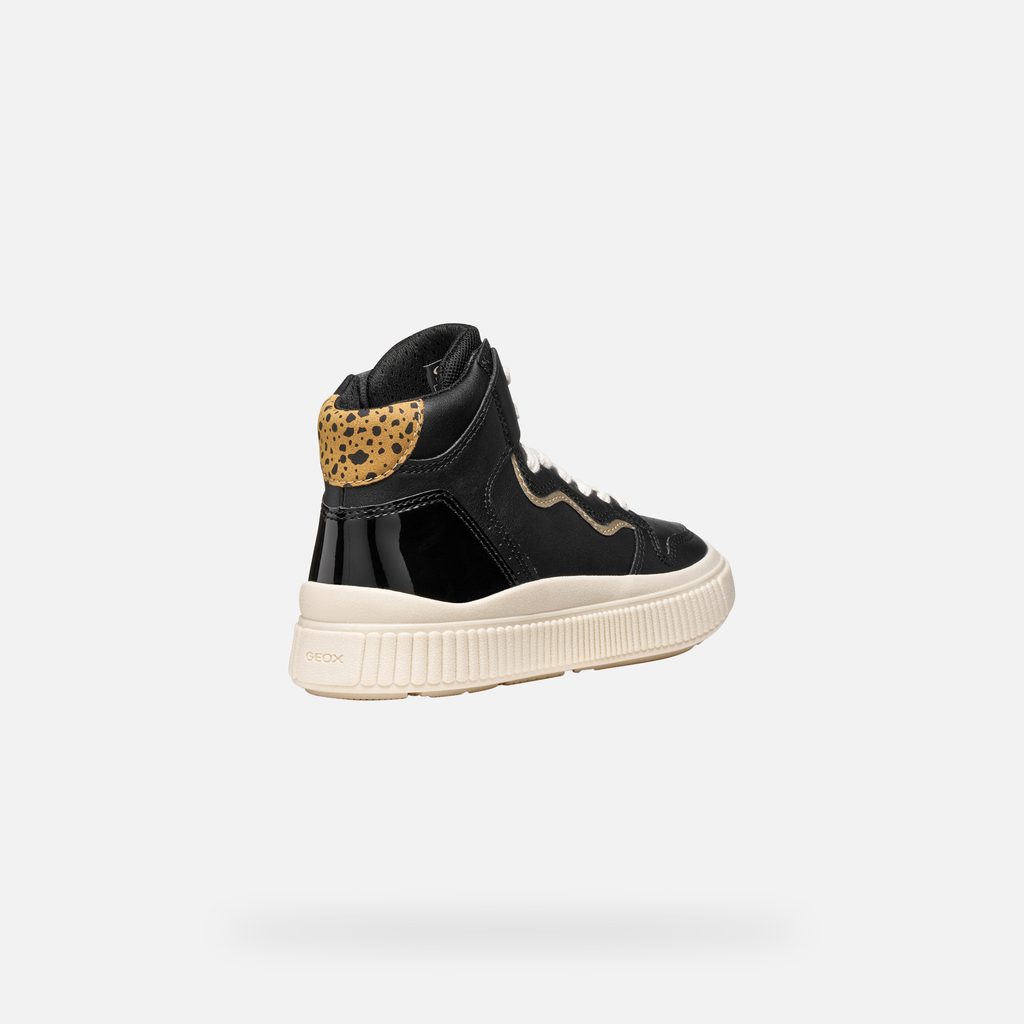 Černé dívčí tenisky Geox Laquinny s designovým zvířecím vzorem a kontrastní podešví.