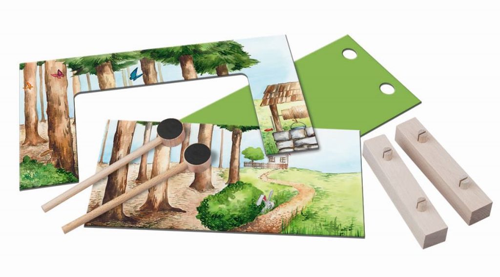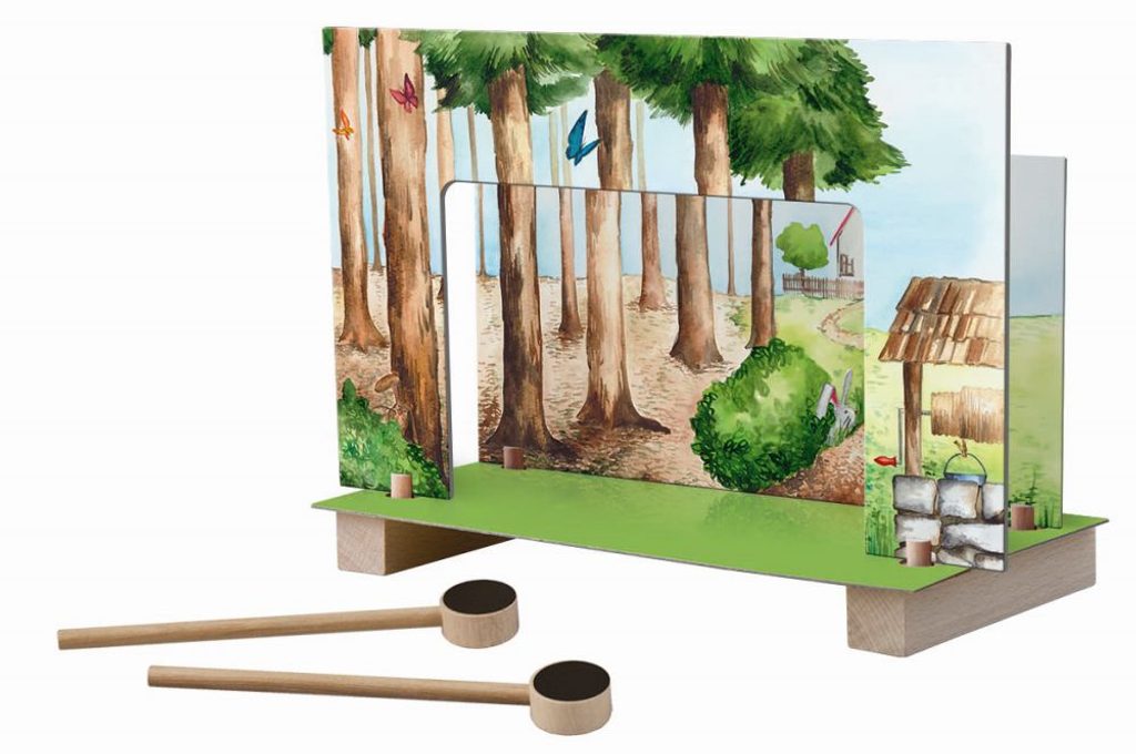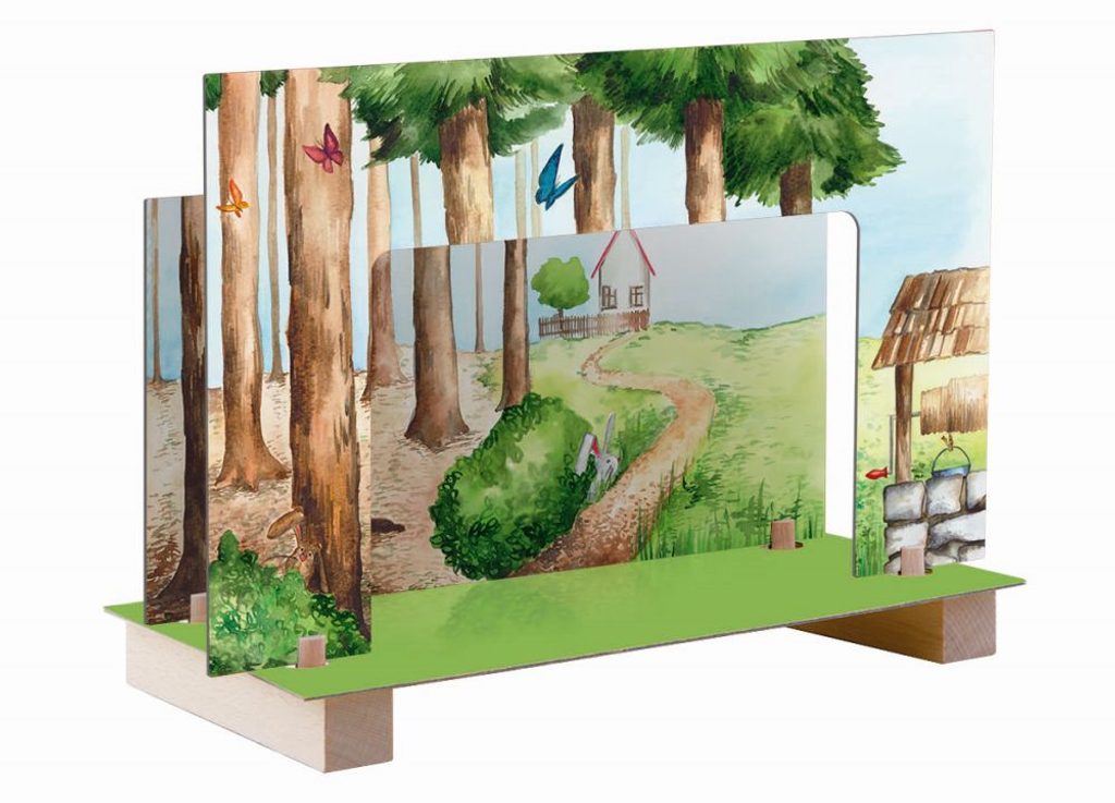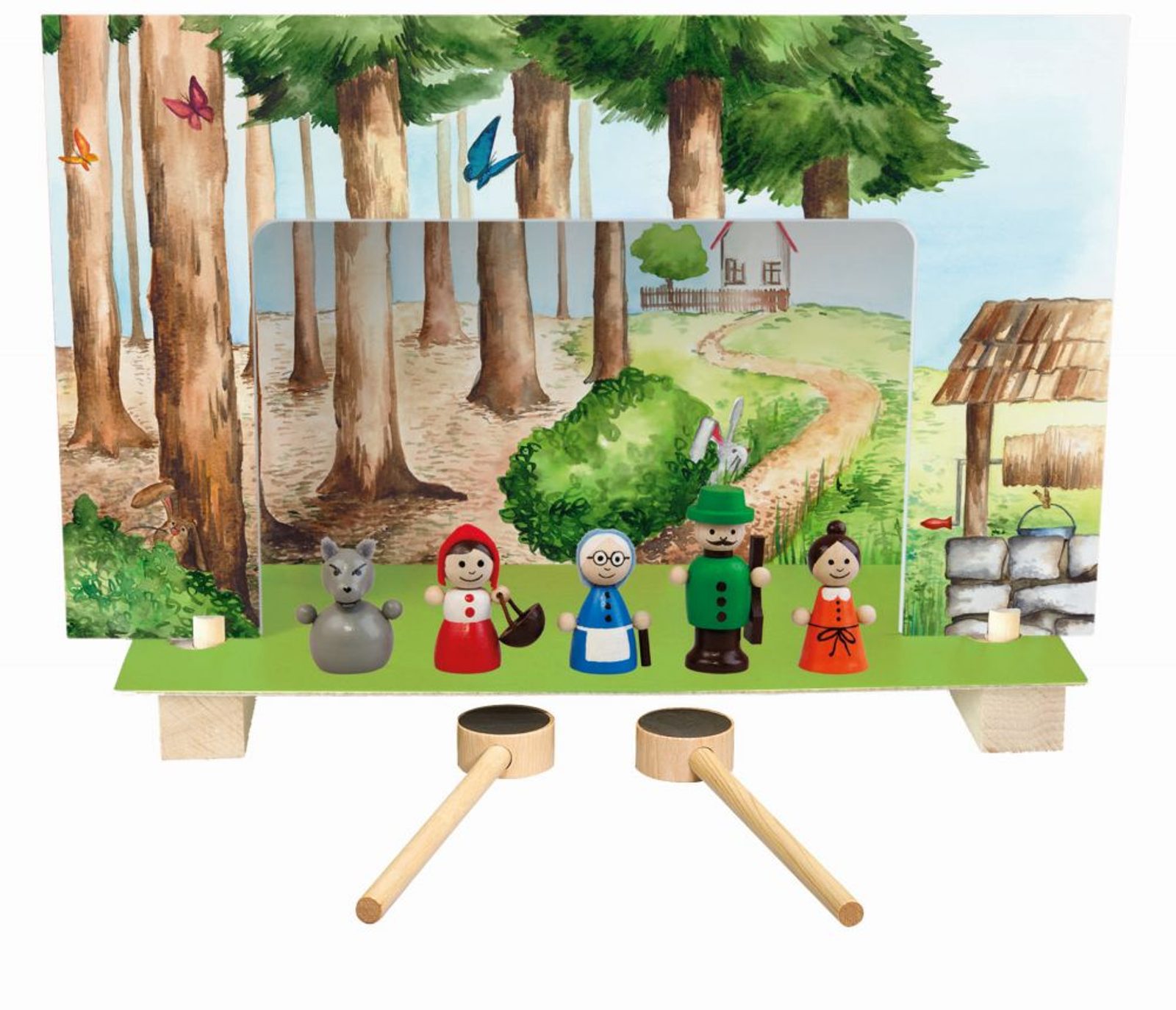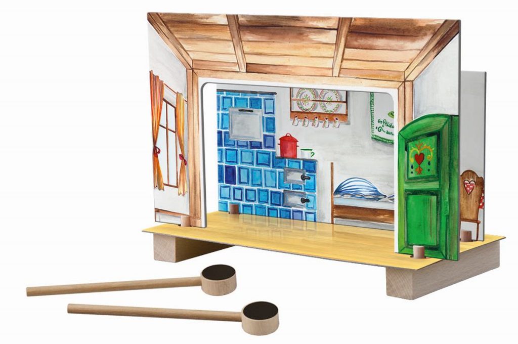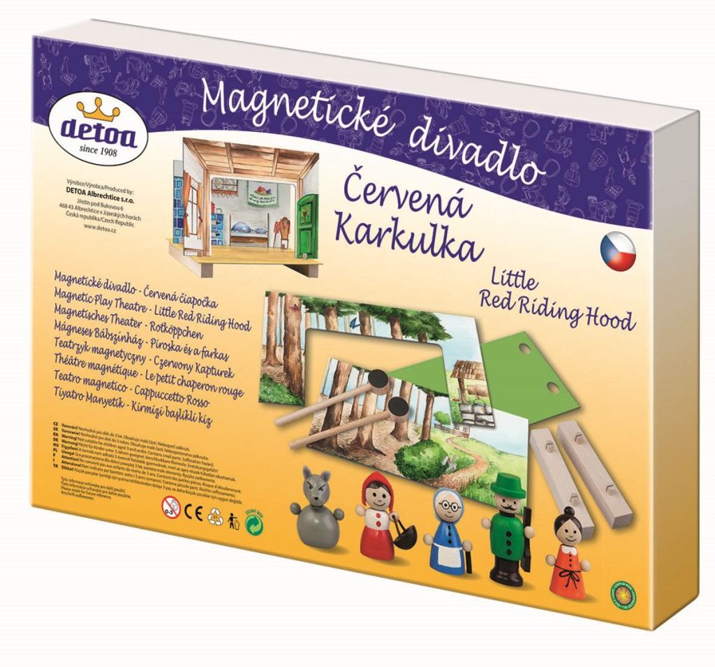 Magnetické divadlo Červená Karkulka obsahuje oboustranně malované kulisy les-chaloupka. Děti si mohou odehrát klasickou pohádku pomocí dřevěných tyček a figurek s magnetem. Výrobek je nevhodný pro děti do 3 let.
