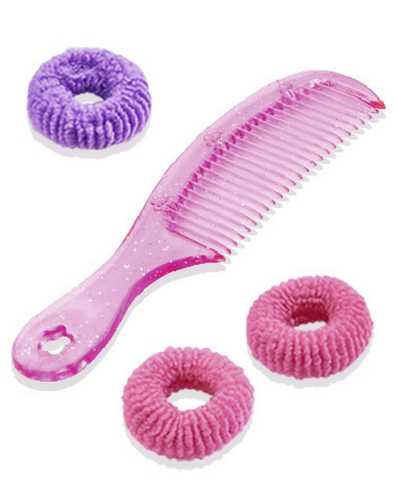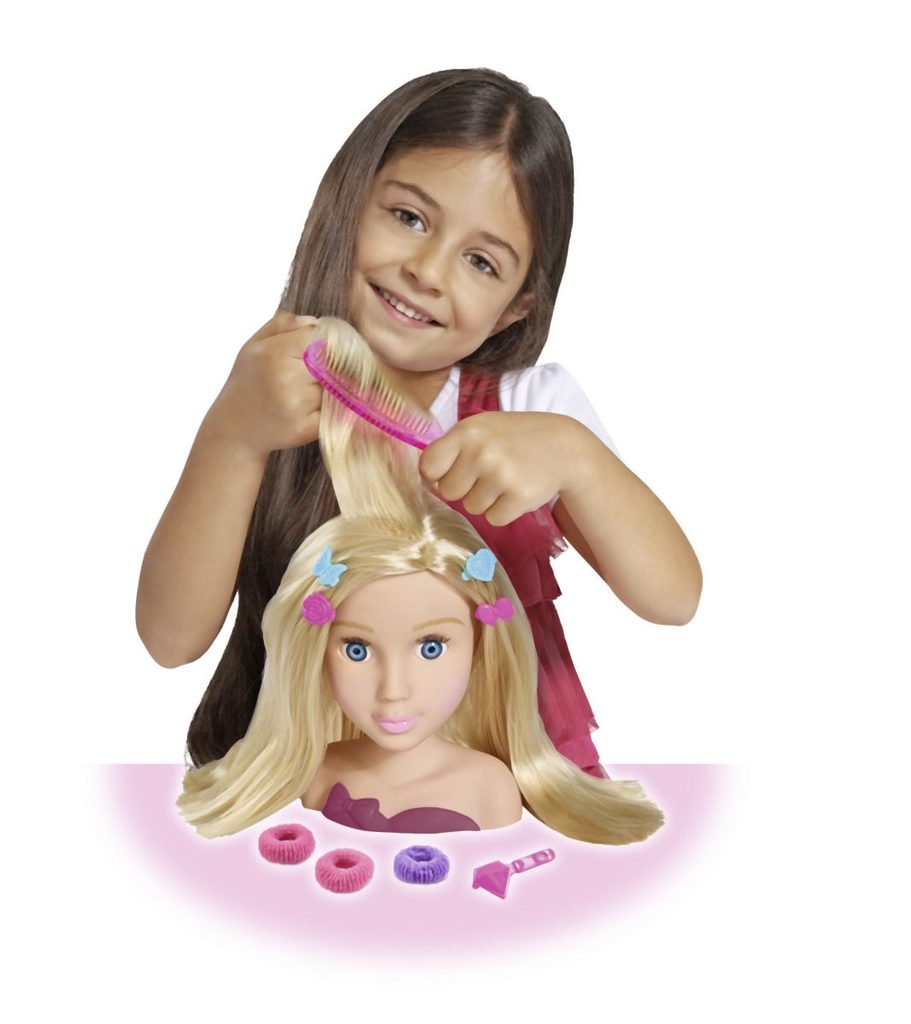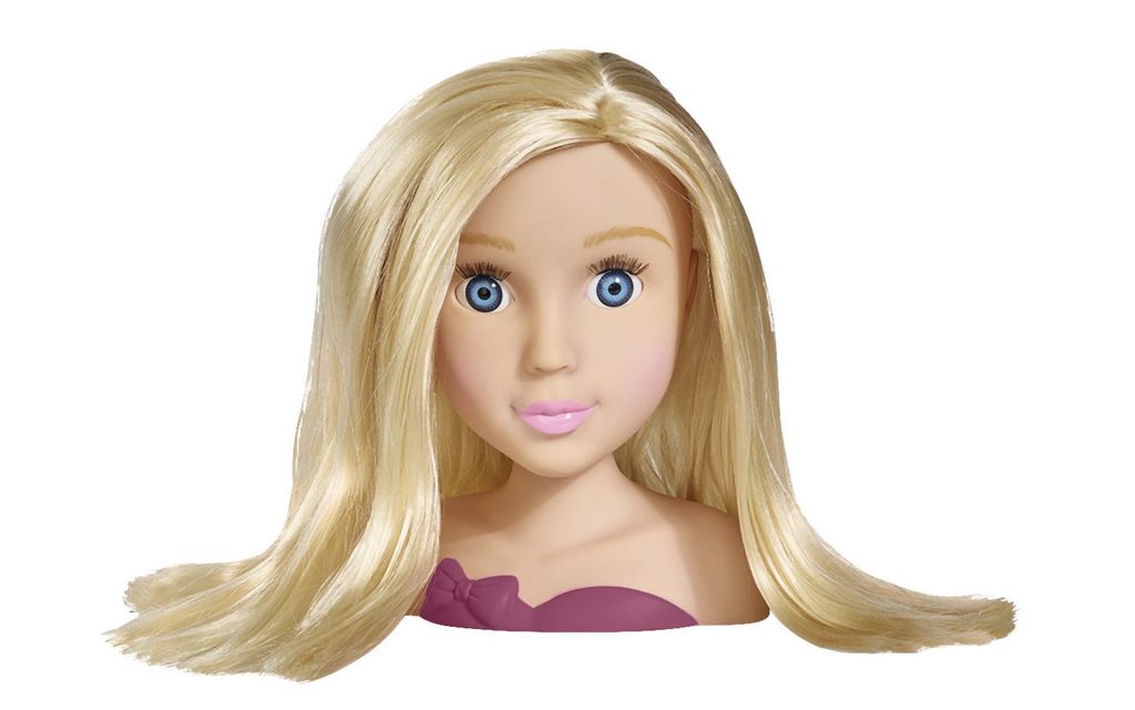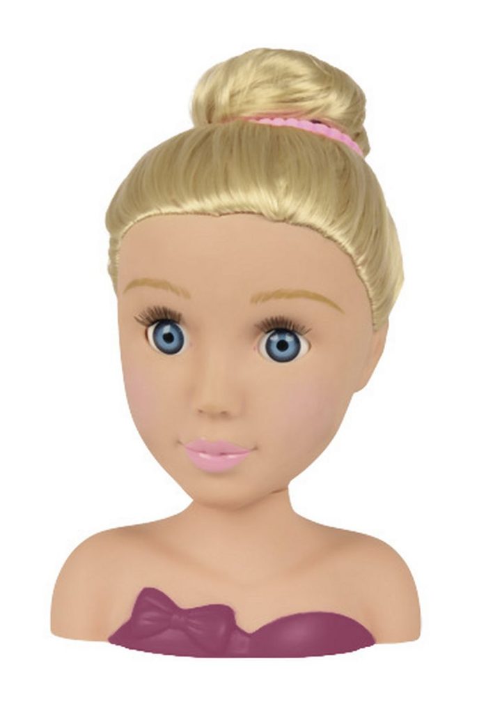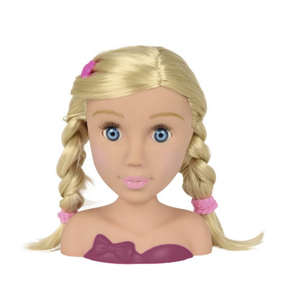 Česací hlava pro zkoušení trendy účesů. Nezbytné doplňky součástí, např. sponky, klipsy do vlasů, hřeben, hřebínek. Celkem obsahuje 10 ks příslušenství. Výška 19 cm.