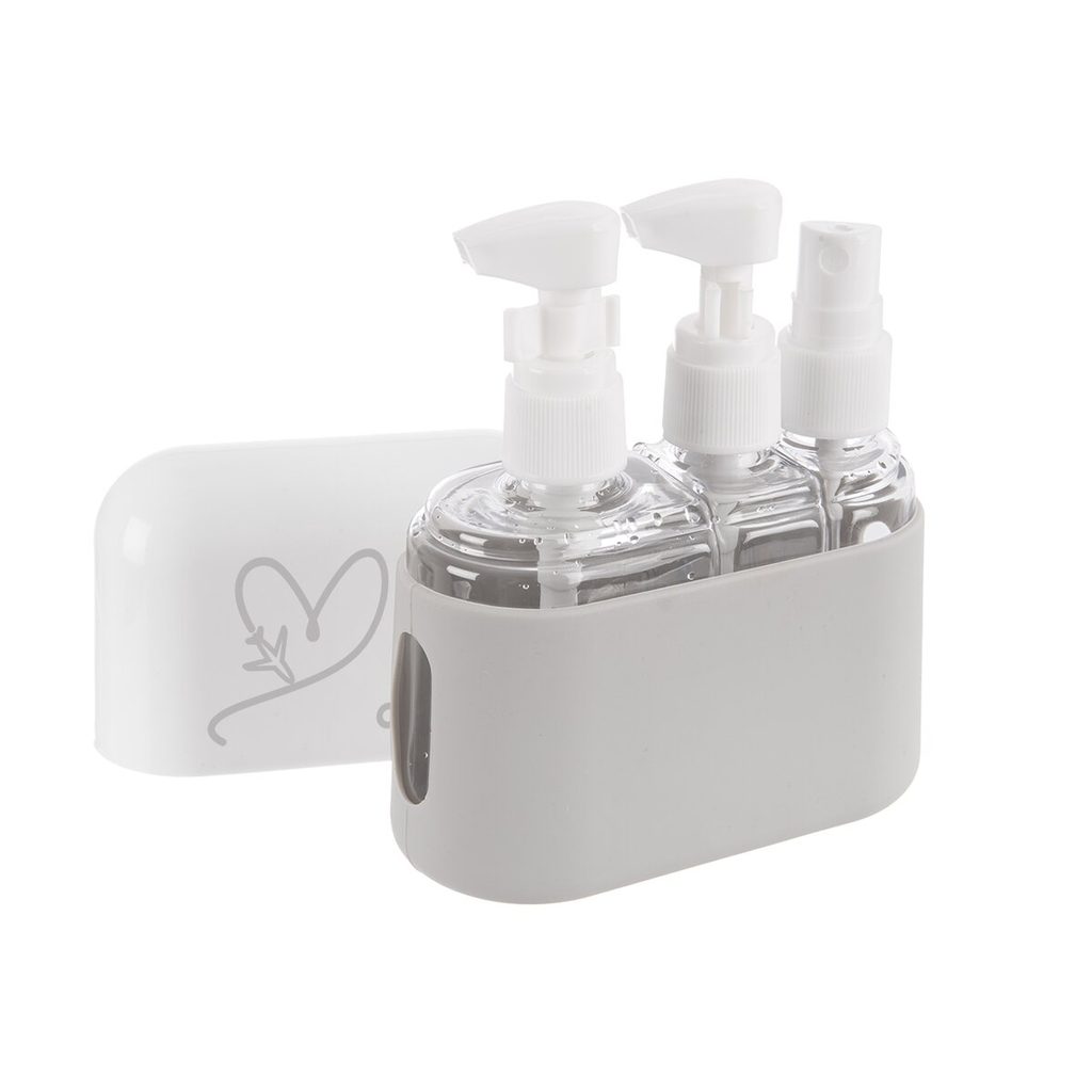 Souprava lahviček v pouzdře, které využijete na vícedenní výlet, služební cestu, pro děti na tábor... Ze svých oblíbených kosmetických přípravků si vezmete jen potřebné množství a ušetříte místo v zavazadle. Tento cestovní set splňuje kritéria pro zavazadla do letadla. Hodí se pro převážení šampónů, kondicionérů, odličovačů, krémů, gelů, voňavek a jiných hygienických pomůcek. Pouzdro obsahuje: 1 lahvičku s rozprašovačem 50 ml (2,8x4x10,5 cm), 1 lahvičku s pumpičkou 50 ml (4x2x11,5 cm) a 1 lahvičku s pumpičkou 110 ml (5x4x11,5 cm). Díky pojistkám se z lahviček nic nevylije. Průhledy na bocích pouzdra zajistí přehled o obsahu lahviček. Materiál: plast PET (tělo lahvičky), plast PP (víko obalu + víko lahviček), silikon (spodní díl obalu). Celkový rozměr pouzdra 10x5x12 cm.