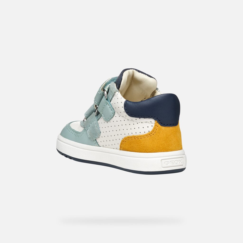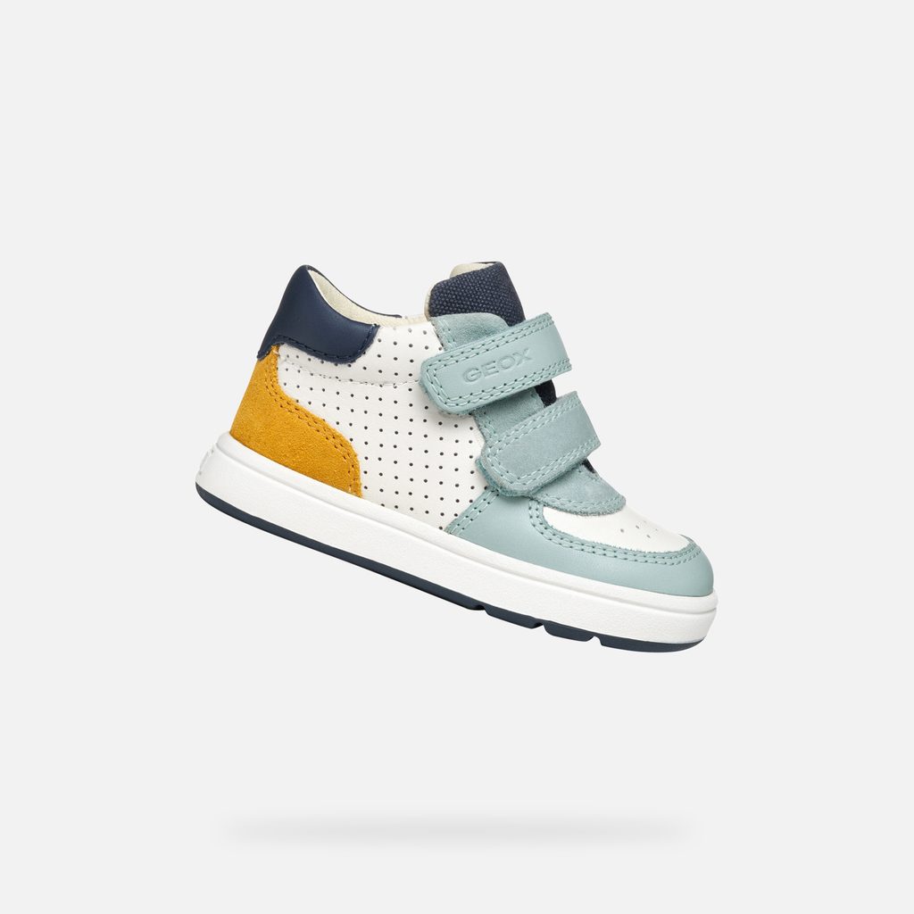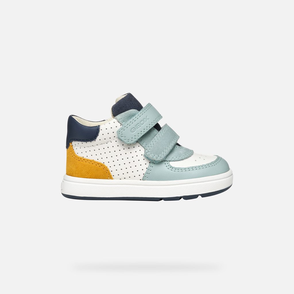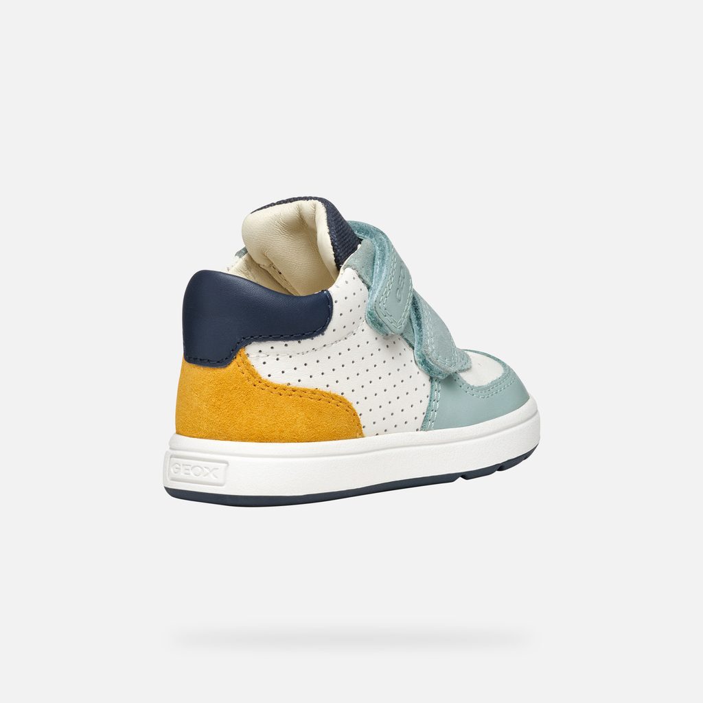 Dětské tenisky Geox Biglia v bílo-modré barevné kombinaci s výraznými žlutými detaily zaujmou svým sportovním designem. Bota je vybavena praktickým zapínáním na dva suché zipy, které zajišťují snadné obouvání a bezpečné držení na noze. Perforovaný vzor na bílé části svršku dodává botě jedinečný vzhled.