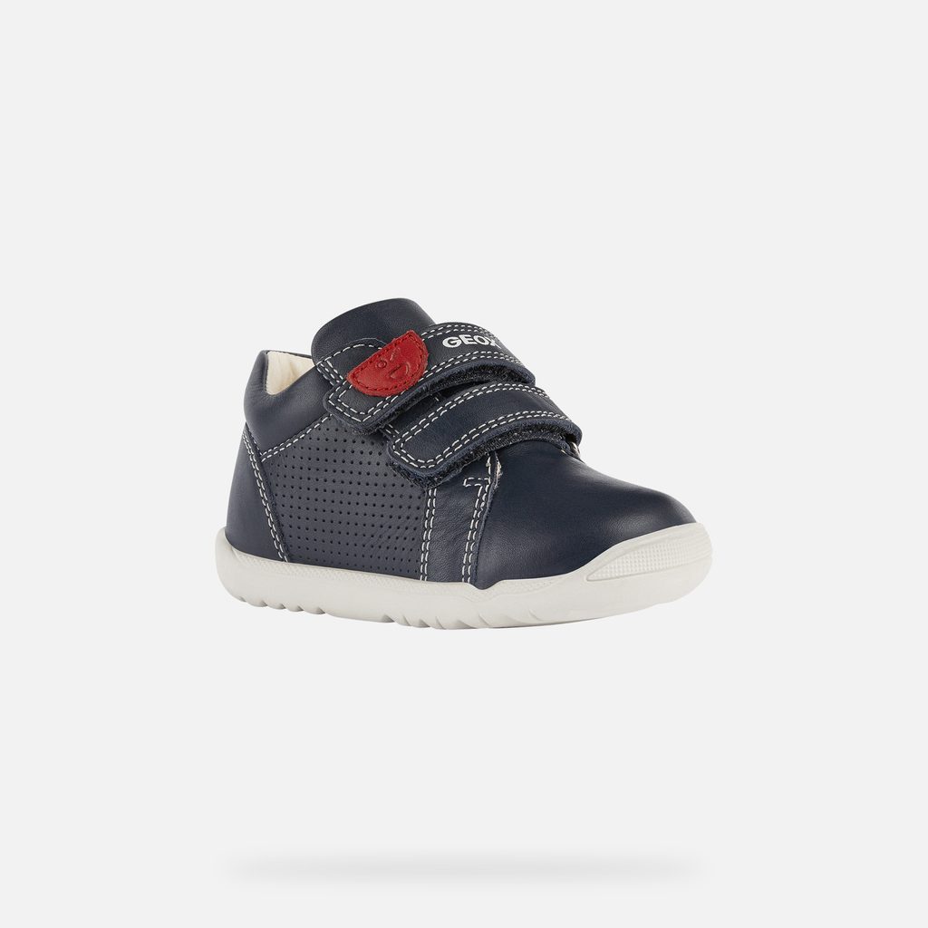 Chlapecká obuv Geox Macchia v tmavě modrém provedení je ideální volbou pro první kroky vašeho dítěte. Vyniká praktickým designem s dvojicí suchých zipů pro snadné obouvání, bílým kontrastním prošíváním a červeným detailem s logem na horním pásku.