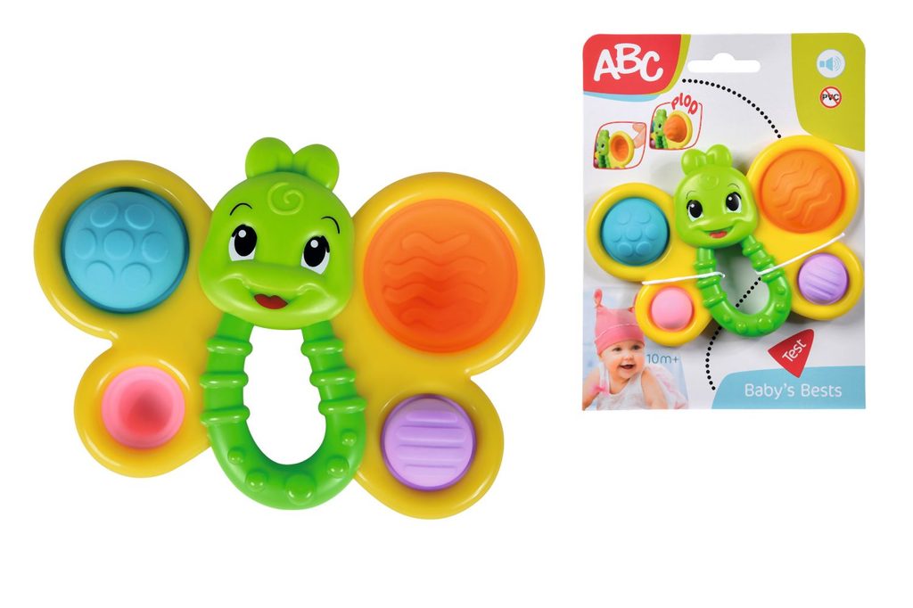 Veselý barevný motýl s rukojetí pro snadné držení a se čtyřmi různými měkkými výplněmi. Délka 14 cm.