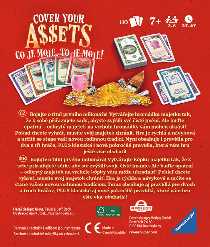 Obsahuje: 110 karet, pravidla hry Bojujte o titul prvního milionáře! Vytvářejte hromádku majetku tak, že k sobě přiřazujete sady, abyste zvýšili své čisté jmění. Ale buďte opatrní – odkrytý majetek na vrcholu hromádky vám mohou protihráči ukrást! Pokud chcete vyhrát, musíte svůj majetek chránit. Hra je rychlá a návyková a určitě se stane vaší novou rodinnou tradicí. Hra CO JE MOJE, TO JE MOJE! obsahuje pravidla pro dva a tři hráče, PLUS klasická i nová pokročilá pravidla, která vám hru ještě více obohatí!