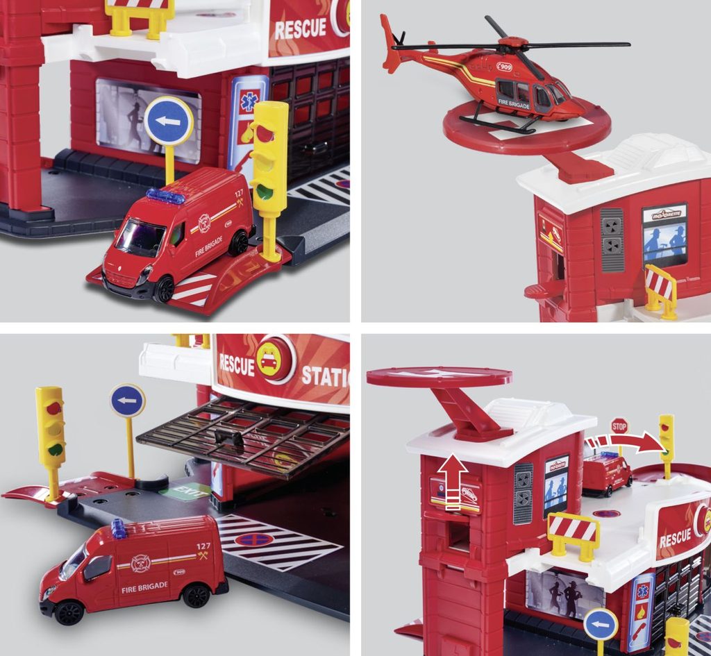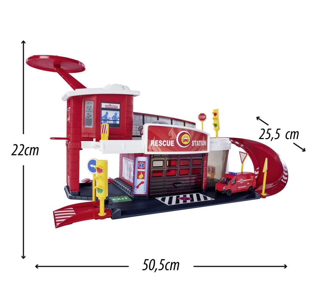 Hasičská stanice, 2 patra, heliport, 1 autíčko součástí. Rozměry: 55,5 x 25,5 x 22 cm.