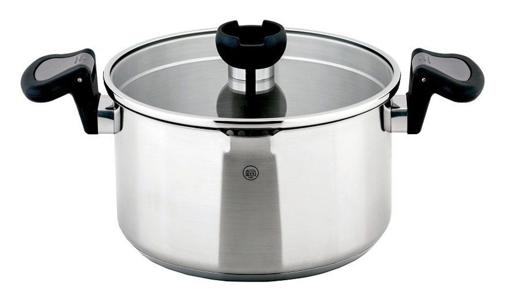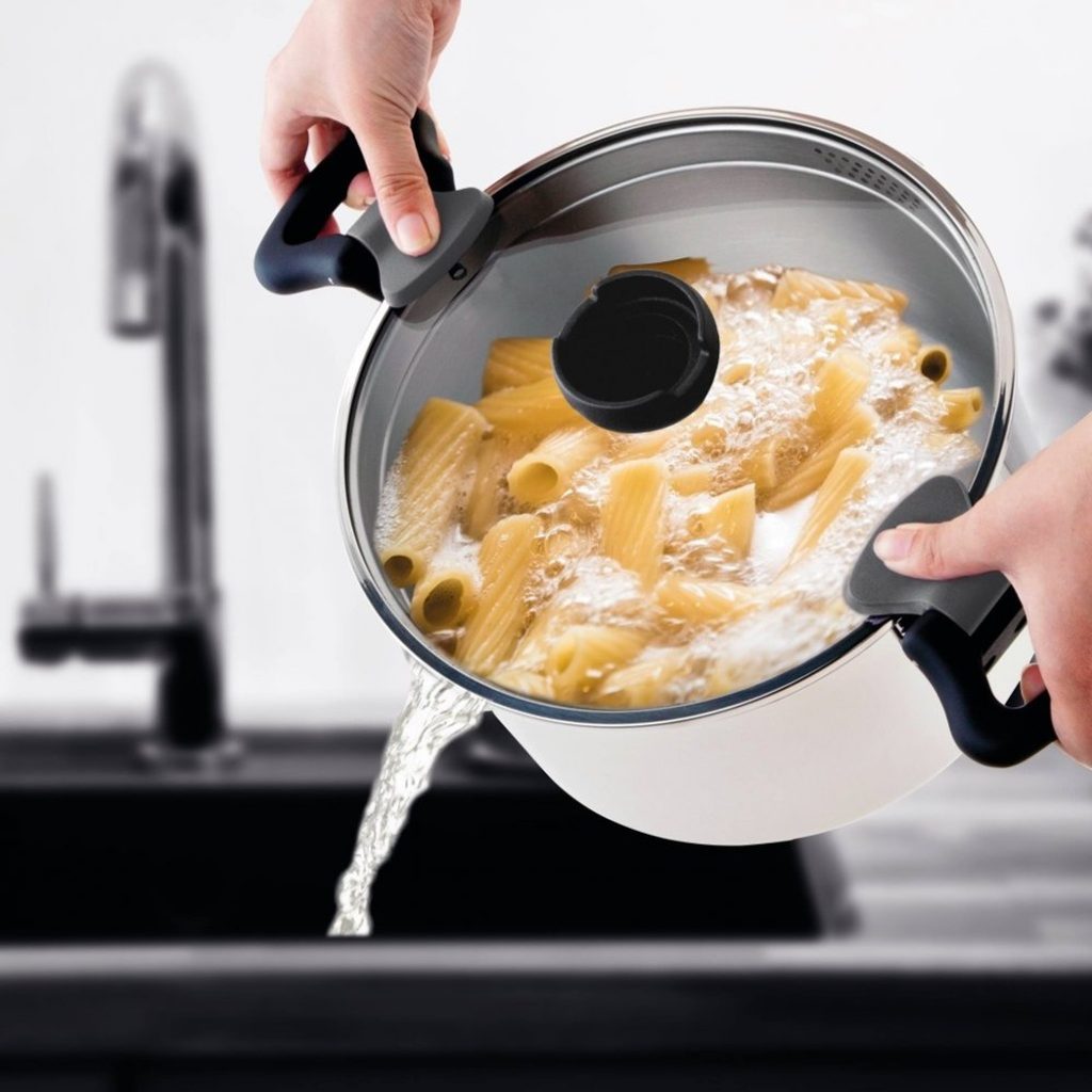 - vnitřní části rukojetí lze ohnout směrem k poklici a zajistit ji tak aby nevyklouzla při cezení, pohodlná vychytávka oceněná Reddot Design Award