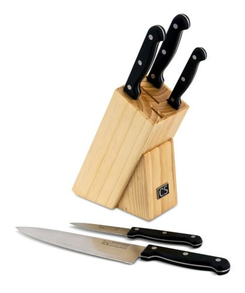 Sada nožů v bloku 6 ks STAR je výbornou alternativou pro kuchaře různých úrovní, na jejíž výrobu byl použit kvalitní materiál: nerez ocel s nepřilnavým povrchem, vynikají perfektní ostrostí čepele a designem. Velmi oceníte i ergonomicky tvarovanou rukojeť, díky které se vám nože budou skvěle držet. Celá sada je dílem výrobce CS SOLINGEN, jež se výrobě nožů věnuje poměrně dlouho a jsou řádně odzkoušeny.