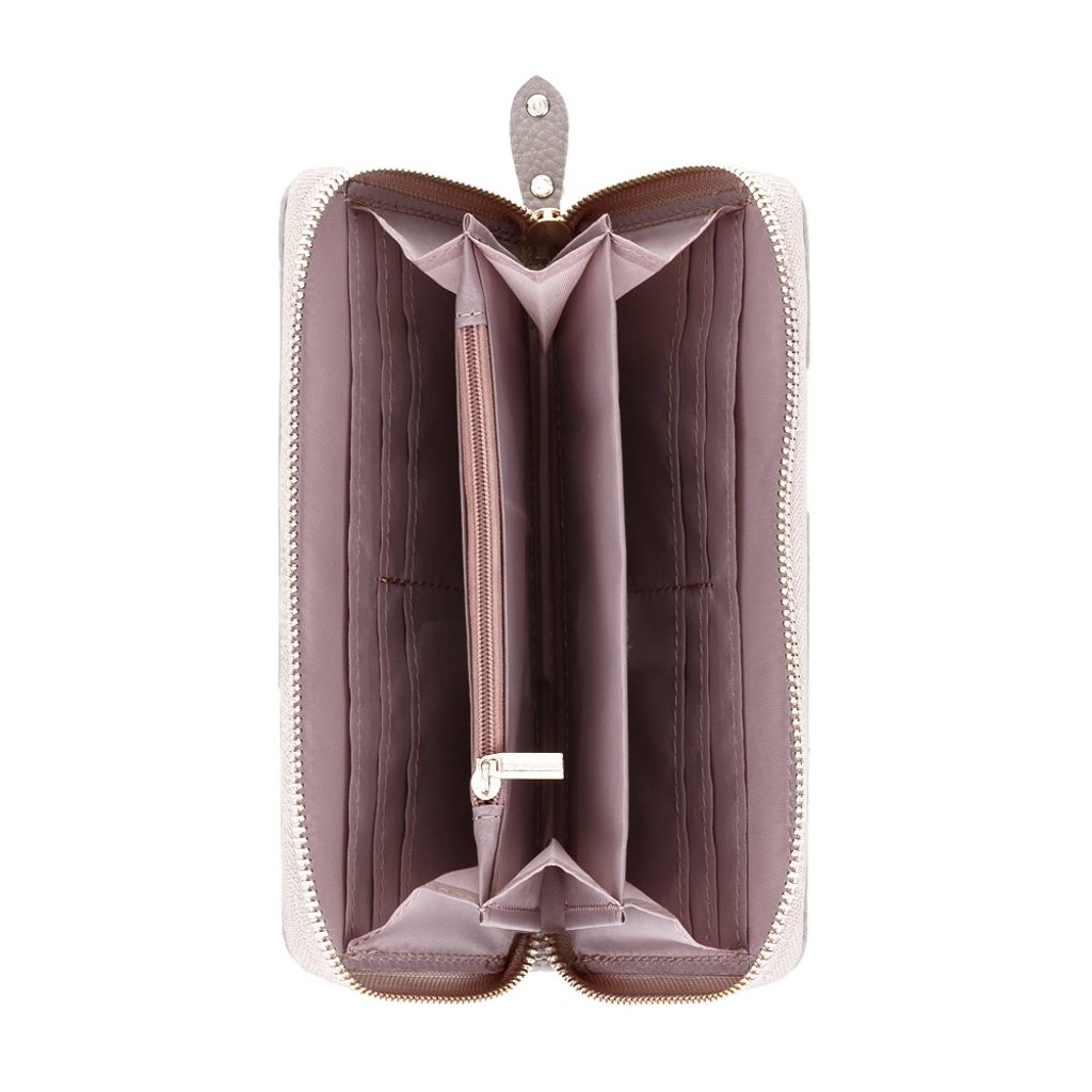 Velká dámská peněženka v mocca provedení. Uvnitř je 8 menších kapes na věrnostní karty, 2 větší kapsy, 3 oddělené přihrádky na hotovost a 1 uzavíratelná kapsa na zip na drobné mince.