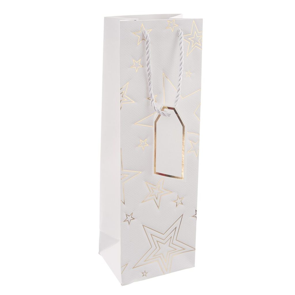 Dárková taška na láhev se dvěma uchy, plastický dekor, na přední straně zdobená zlatými hvězdami, doplněna jmenovkou. Bílá. Materiál: papír, provázek – polyester. Rozměry: 12x9x36 cm.