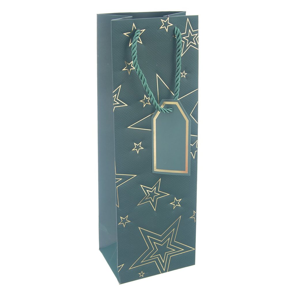 Dárková taška na láhev se dvěma uchy, plastický dekor, na přední straně zdobená zlatými hvězdami, doplněna jmenovkou. Zelená. Materiál: papír, provázek – polyester. Rozměry: 12x9x36 cm.