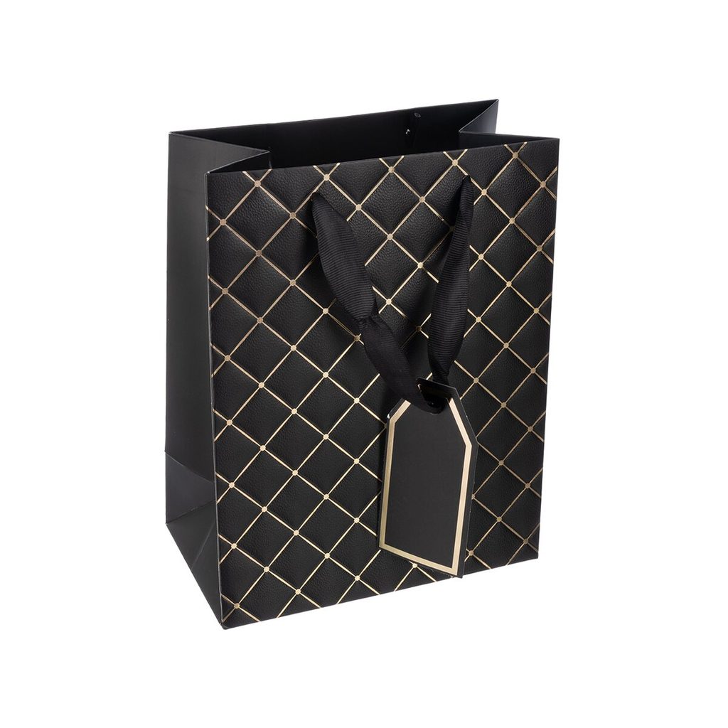 Elegantní dárková taška se dvěma uchy z černé stuhy, plastickým dekorem mřížky z obou stran, zvýrazněná zlatou linkou na přední straně, doplněná praktickou jmenovkou. Černá. Materiál: papír, stužka – polyester. Rozměry: 18x10x23 cm.