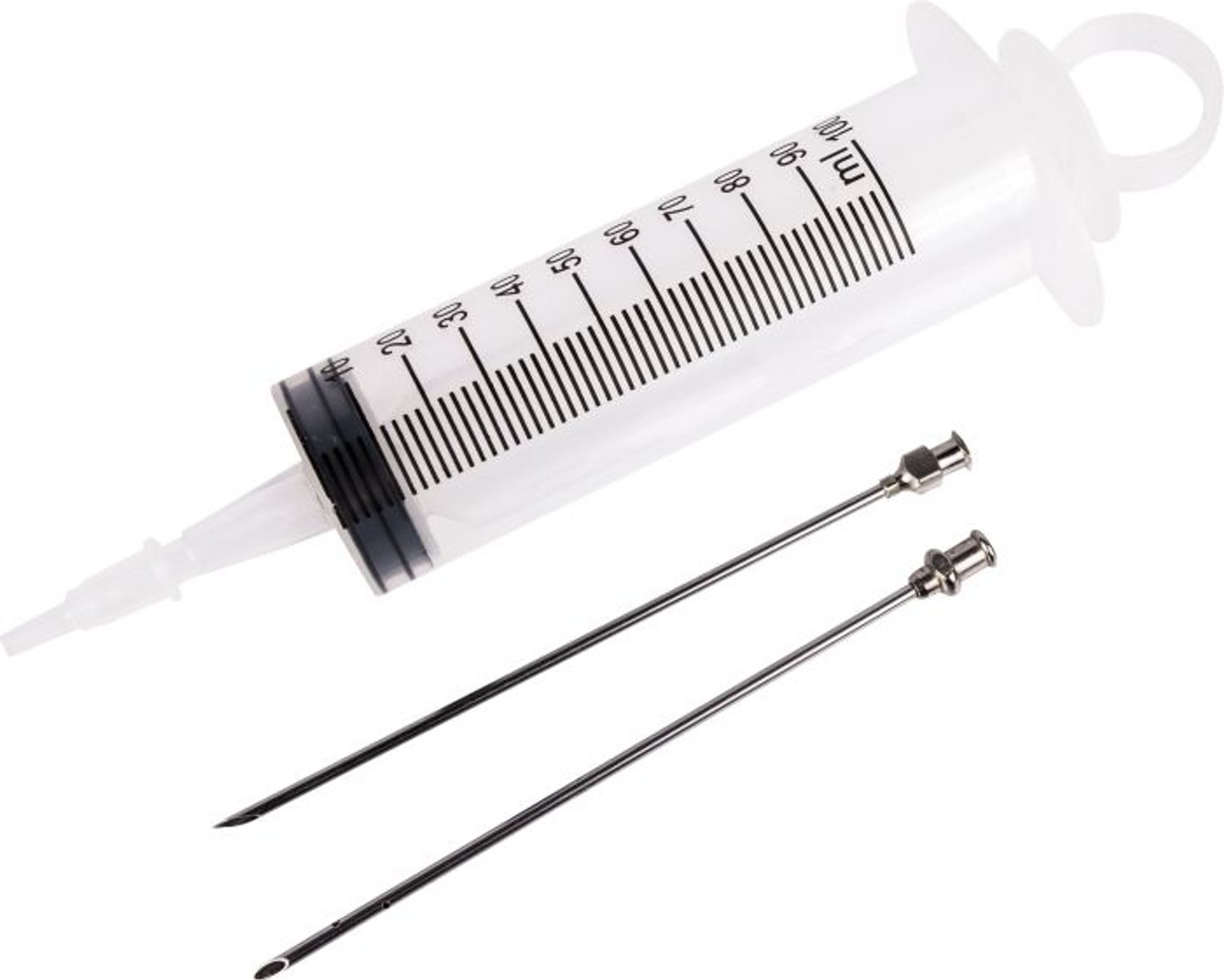 Sada obsahuje: opakovaně použitelnou injekční stříkačku (100 ml) vyrobenou z pružného plastu se stupnicí po 2ml, dále 2 jehly (13,5 cm) vyrobené z nerezové oceli, redukci pro uchycení jehel. Jedna z jehel má boční otvory, které usnadňují rychlé vstřikování do větších porcí masa. Redukce na uchycení jehly je uvnitř stříkačky.