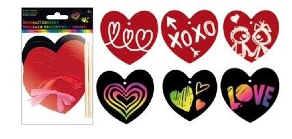 - dekorace SRDÍČKO 11cm, 6ks, škrabací, 2rydla, 6mašliček