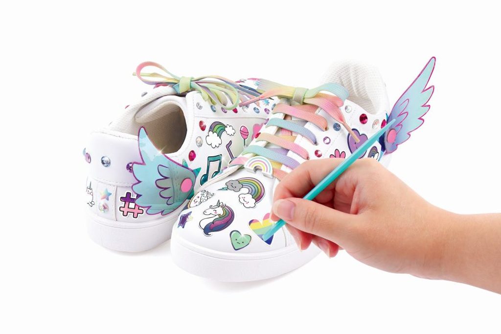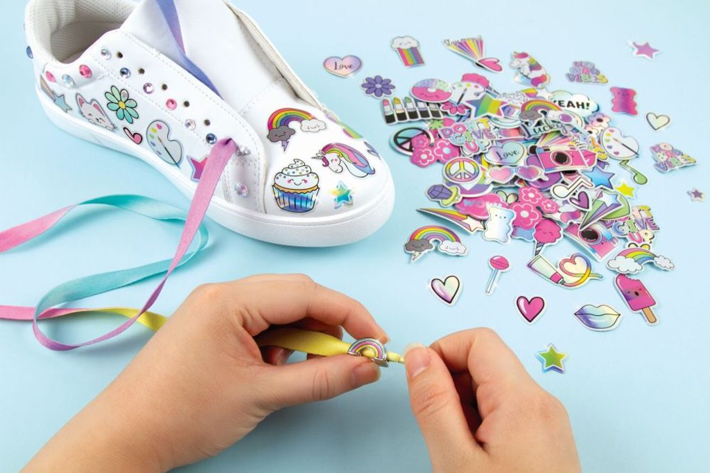 Dočasné tetování pro vaše boty. Dodejte své obuvy šmrnc pomocí dekorativních samolepek. Přidejte jich jen trochu nebo hodně. Proměňte své boty znovu a znovu. Zahrnuje korálkové přívěsky a tkaničky do bot. Přebytečné množství odstraňte teplou vodou. Věk od 8+.