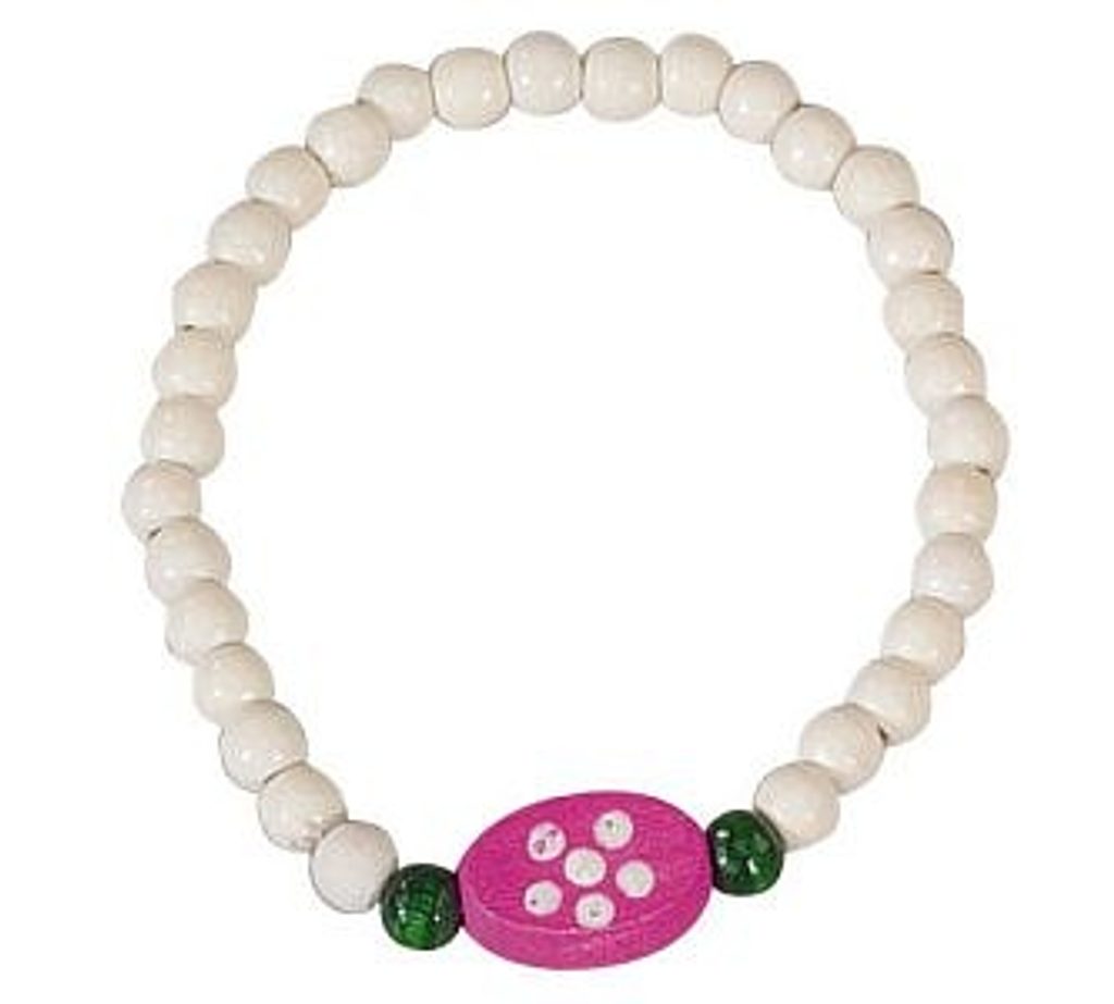 Dětská bižuterie z dřevěných perlí navlečených na gumičce. Délka náramku je cca 70 mm. Nevhodné pro děti do 3 let. Obsahuje malé části. Výrobek je zdravotně nezávadný