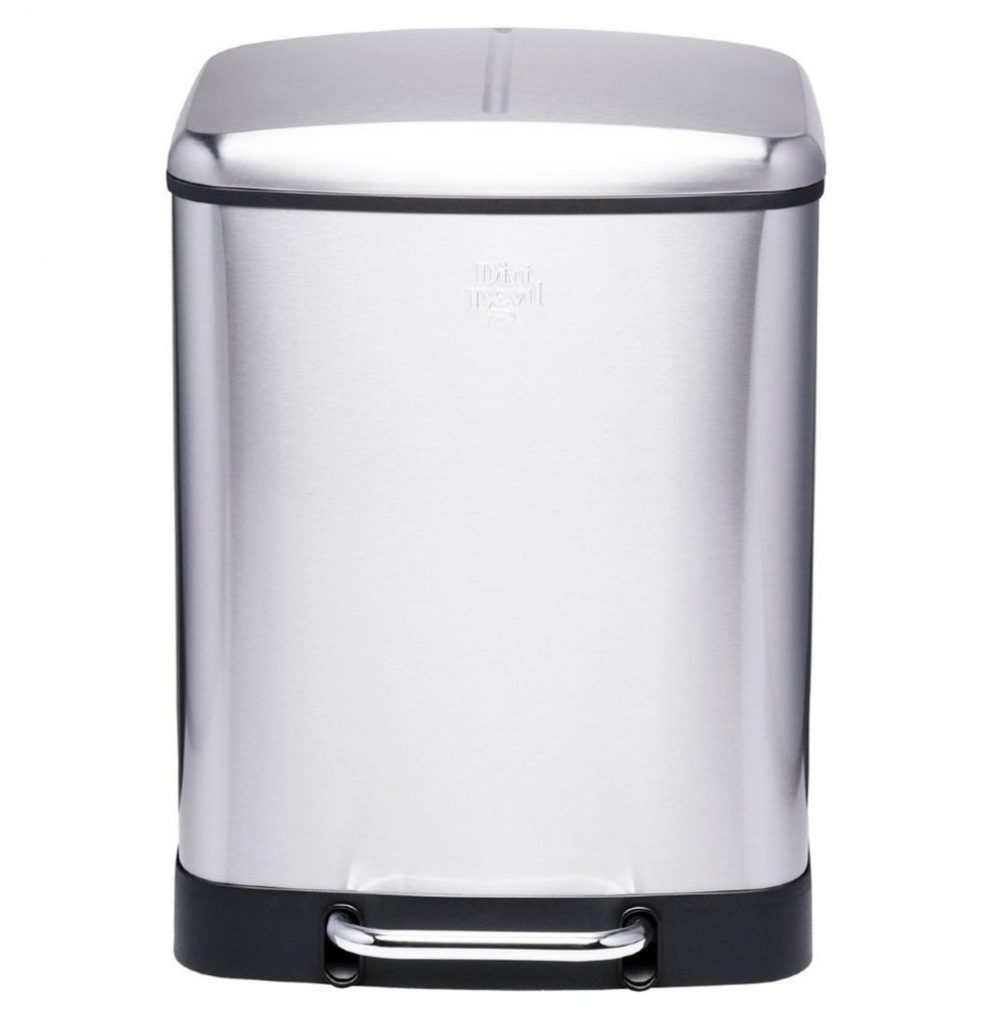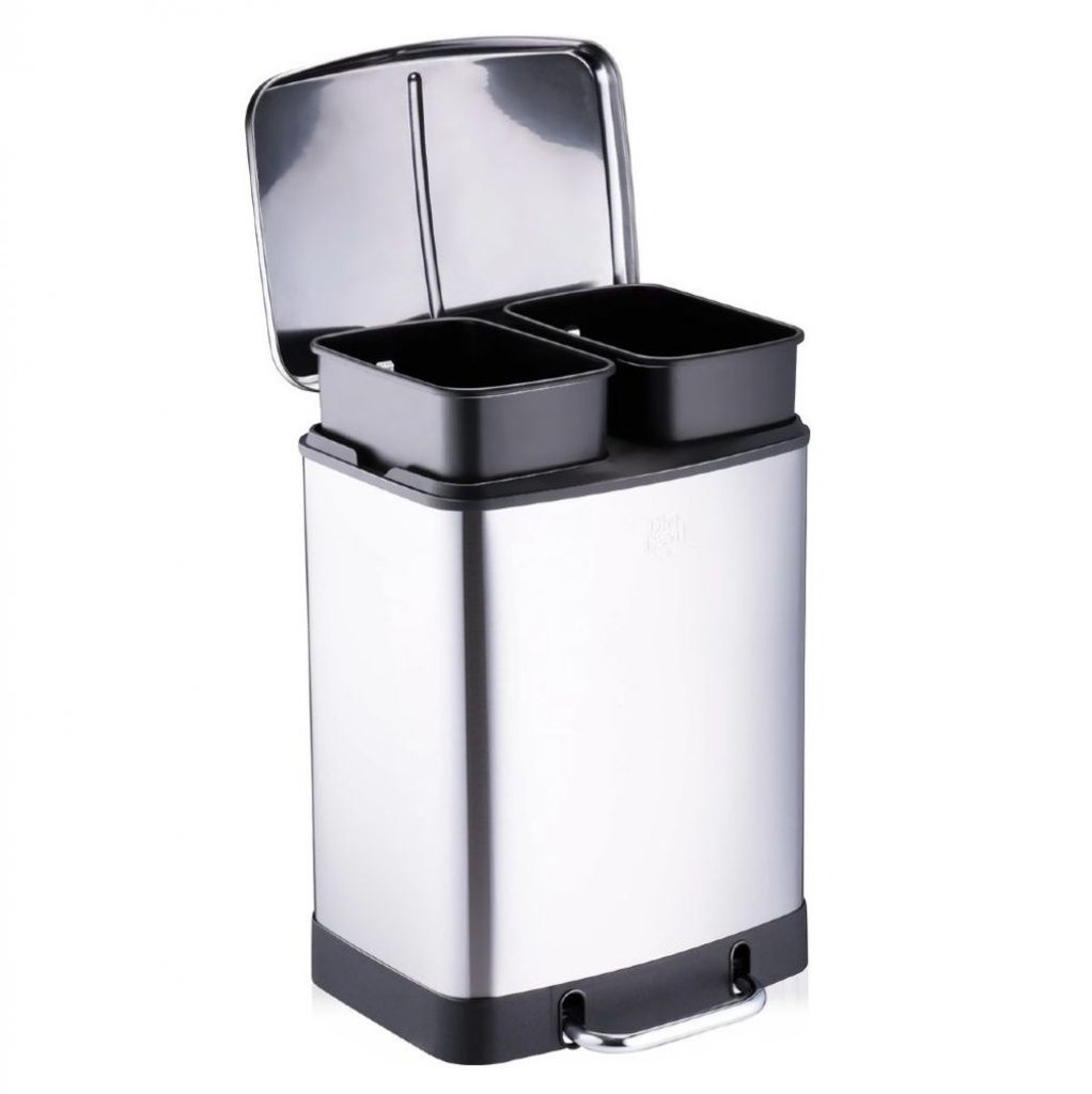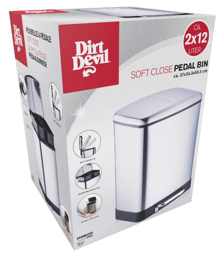 DIRT-DEVIL Odpadkový koš na tříděný odpad 2 x 12 l tiché zavírání ED-249502 Nakládejte s odpadem ve vaší domácnosti vědomě díky tomuto odpadkovému koši Dirt Devil se 2 přihrádkami. Moderní šlapací odpadkový koš má 2 samostatné nádoby o objemu 12 litrů. Díky tomu je třídění odpadu mnohem jednodušší, protože do jednoho kontejneru můžete dát například plast a do druhého karton a papír. Díky nožnímu pedálu ve spodní části systému separace odpadu můžete otevřít víko bez použití rukou. Víko systému separace odpadu je vybaveno mechanismem soft-close. To znamená, že víko se zavírá tiše a tiše a zápach tak rychle neuniká. Pedálový odpadkový koš je vyroben z nerezové oceli stříbrné barvy. Tento materiál je známý tím, že je pevný a odolný, ale také se snadno udržuje v čistotě.