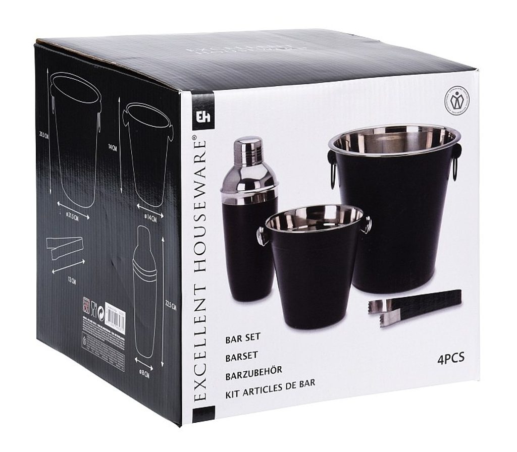 EXCELLENT HOUSEWARE Barmanská sada 4 ks nerez černá KO-A12405600 - kompletní barmanský set v atraktivním černo/nerezovém provedení- materiál: nerezová ocel- matný černý povrch, nerezové vnitřní části- kvalitní provedení, dlouhá životnost- vhodné do myčky nádobí, pro zachování dlouhotrvajícího dokonalého vzhledu se však doporučuje ruční mytí- kompletní sada 4 ks obsahuje:- 1x shaker na koktejly s víčkem a sítkem: objem 0.5 l / výška 22.5 cm- 1x kyblík na led: horní průměr 14 x výška 14 cm- 1x kyblík na víno, sekt či šampaňské: horní průměr 20 x výška 21.5 cm- 1x kleště na led 12 cm