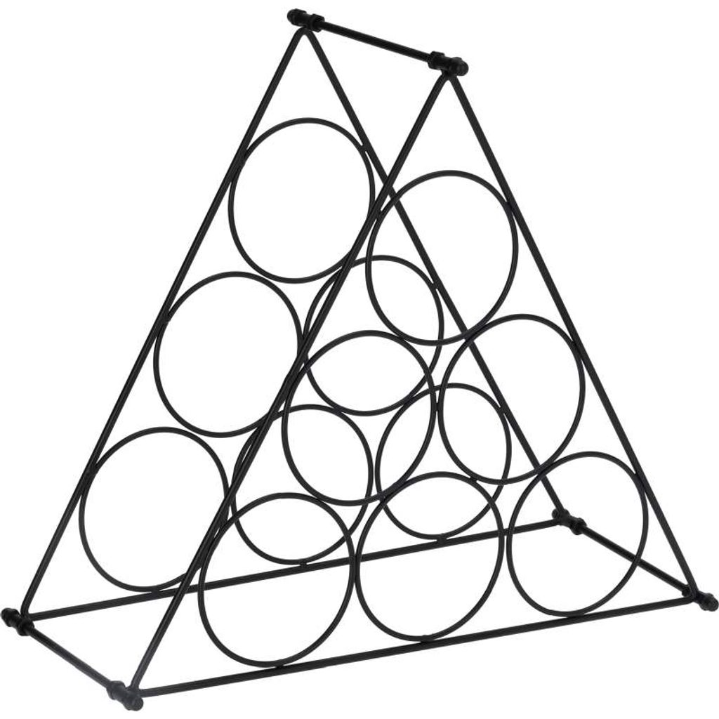 Stylový kovový regál na víno s trojúhelníkovým tvarem a kapacitou pro 6 lahví. Ideální pro uskladnění vína a jeho elegantní vystavení.