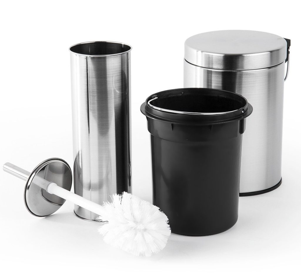 Elegantní a praktická sada pro vaši koupelnu. Obsahuje pedálový odpadkový koš a WC štětku s držákem, oba vyrobené z kartáčované nerezové oceli. Moderní design se hodí do každého interiéru a zajišťuje dlouhou životnost.