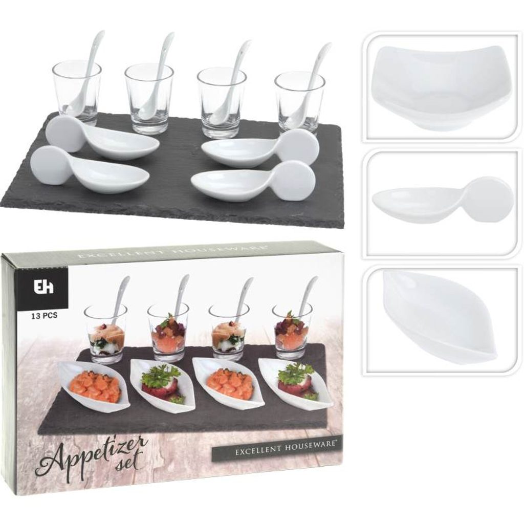 EXCELLENT HOUSEWARE Sada na servírování pokrmů 13 ks loďka KO-210000480lodk - servírovací set misek (kanapek) a skleniček se lžičkou na tácu pro nejrůznější příležitosti- materiál: porcelán / sklo / břidlice- barva: bílá / transparentní / šedá- perfektní pro servírování předkrmů, pochutin, dipů a omáček- vhodné do myčky nádobí- sada obsahuje břidlicový podnos s protiskluzovými nožkami, 4 porcelánové misky (kanapky), 4 skleničky a 4 porcelánové lžičky- rozměry podnosu: 295 x 200 x 5mm- rozměr skleniček: pr. 42 x 60 mm- průměr dna skleniček: 42 mm- rozměr lžiček: 92 x 20 mm- tvar misky (kanapky): loďka- značka: Excellent Houseware