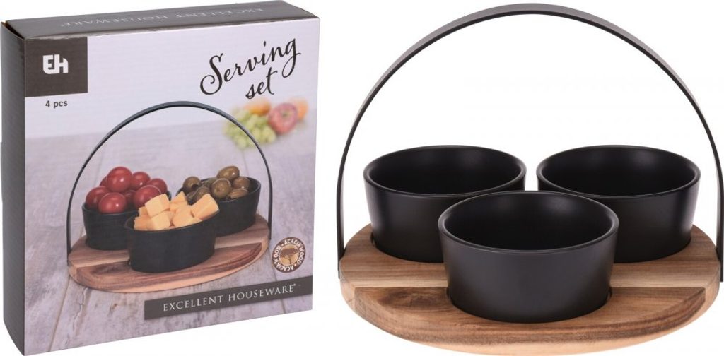 EXCELLENT HOUSEWARE Servírovací misky s podnosem sada 4 ks akát / černá KO-278000510 - servírovací set misek a podnosu pro nejrůznější příležitosti- materiál: kamenina s matnou glazurou- podnos z akáciového dřeva s připravenými otvory pro misky, mističky díky tomu drží na místě- jednoduché a rychlé přenášení díky rukojeti- perfektní pro servírování předkrmů, pochutin, dipů a omáček- žáruvzdorné do 200 °C, misky lze využít také k zapékání- vhodné do myčky nádobí- sada obsahuje 3 kusy misek a podnos- rozměry jedné misky cca: 9,5 x 4 cm- průměr podnosu: 20 cm