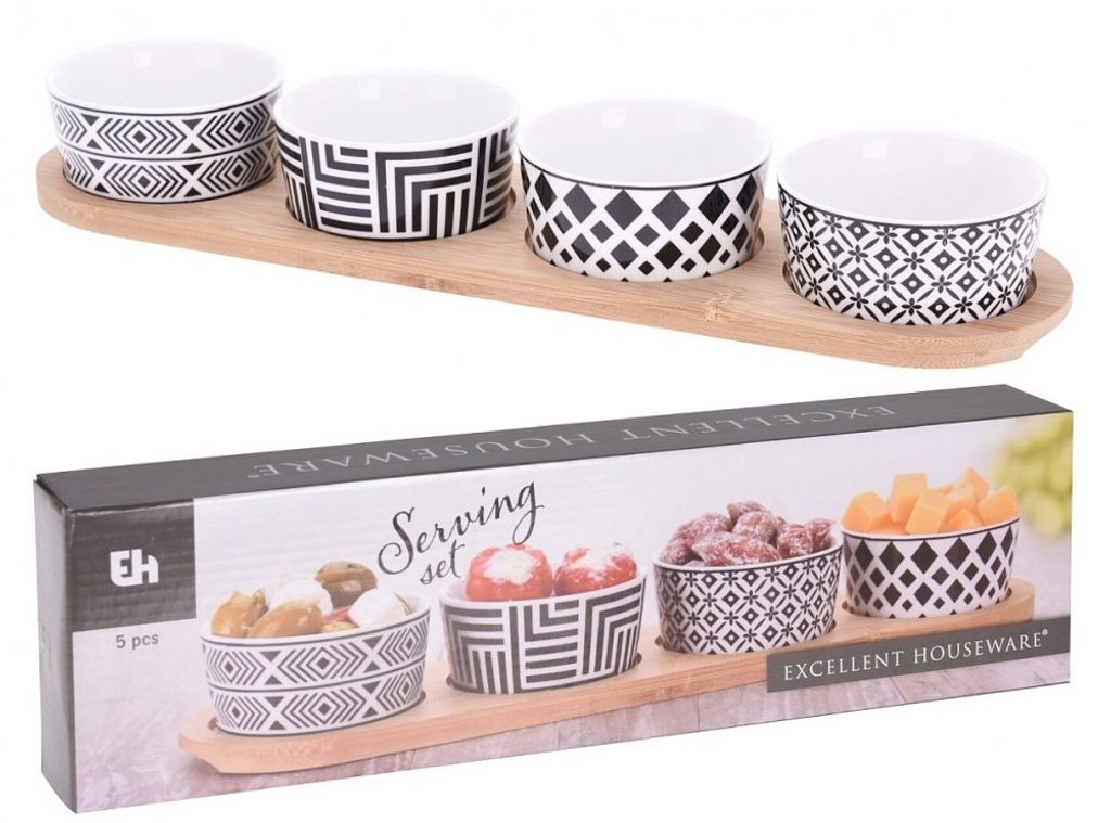 EXCELLENT HOUSEWARE Servírovací misky s podnosem sada 5 ks KO-278000220 - servírovací set vzorovaných misek a podnosu pro nejrůznější příležitosti- materiál: bílý porcelán s lesklou glazurou- podnos z bambusového dřeva s připravenými otvory pro misky, mističky díky tomu drží na místě- perfektní pro servírování předkrmů, pochutin, dipů a omáček- žáruvzdorné do 200 °C, misky lze využít také k zapékání- vhodné do myčky nádobí- sada obsahuje 4 kusy misek a podnos- rozměry jedné misky cca: 8,5 x 4 cm- rozměry podnosu: 38 x 10 cm