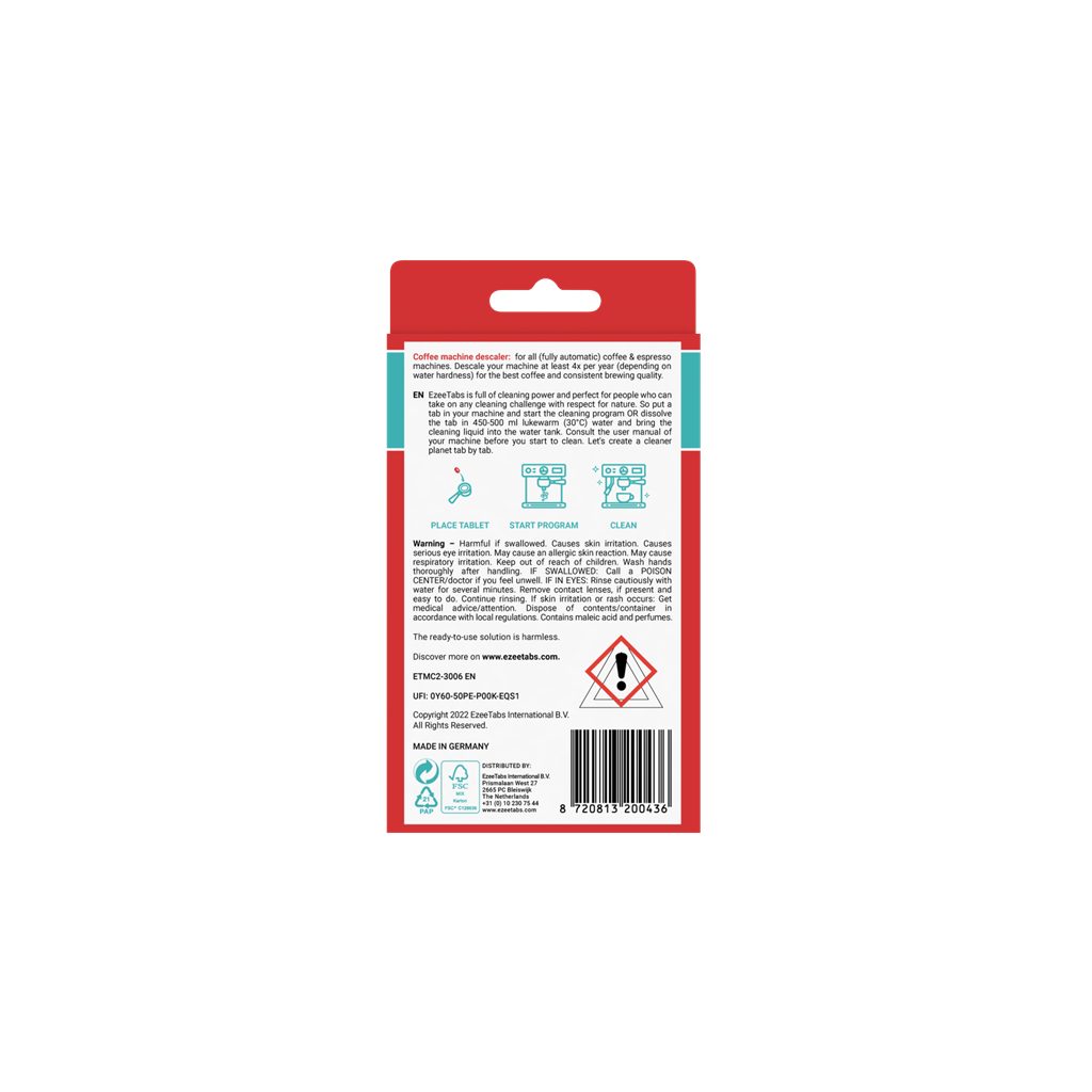 Čističe EzeeTabs jsou vyvinuty a vyrobeny v továrně v Německu. V této továrně vynalezly tablety pro myčky nádobí ve formě, v jaké je známe dnes. S více než 40letými zkušenostmi ve výrobě industriálních čističů vyvinuly ekologické čistící tablety EzeeTabs s maximální účinností a minimálním dopadem na životní prostředí.