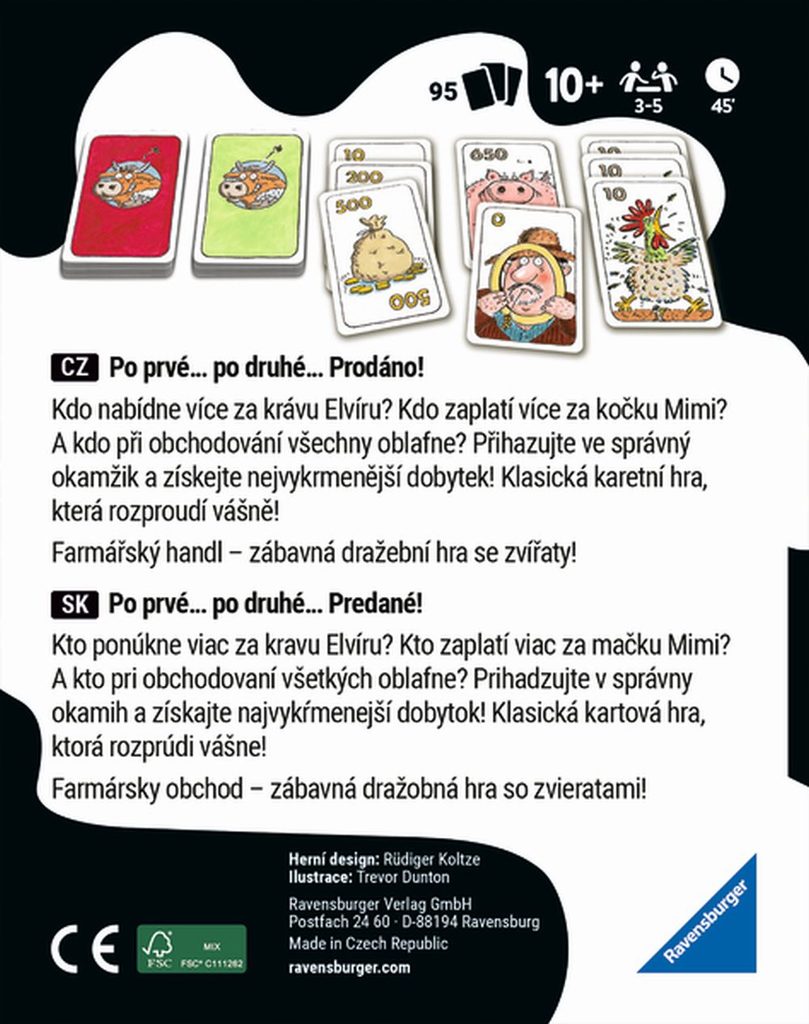 Obsahuje: 40 karet zvířat, 55 karet peněz, pravidla hry Po prvé ... po druhé ... Prodáno!