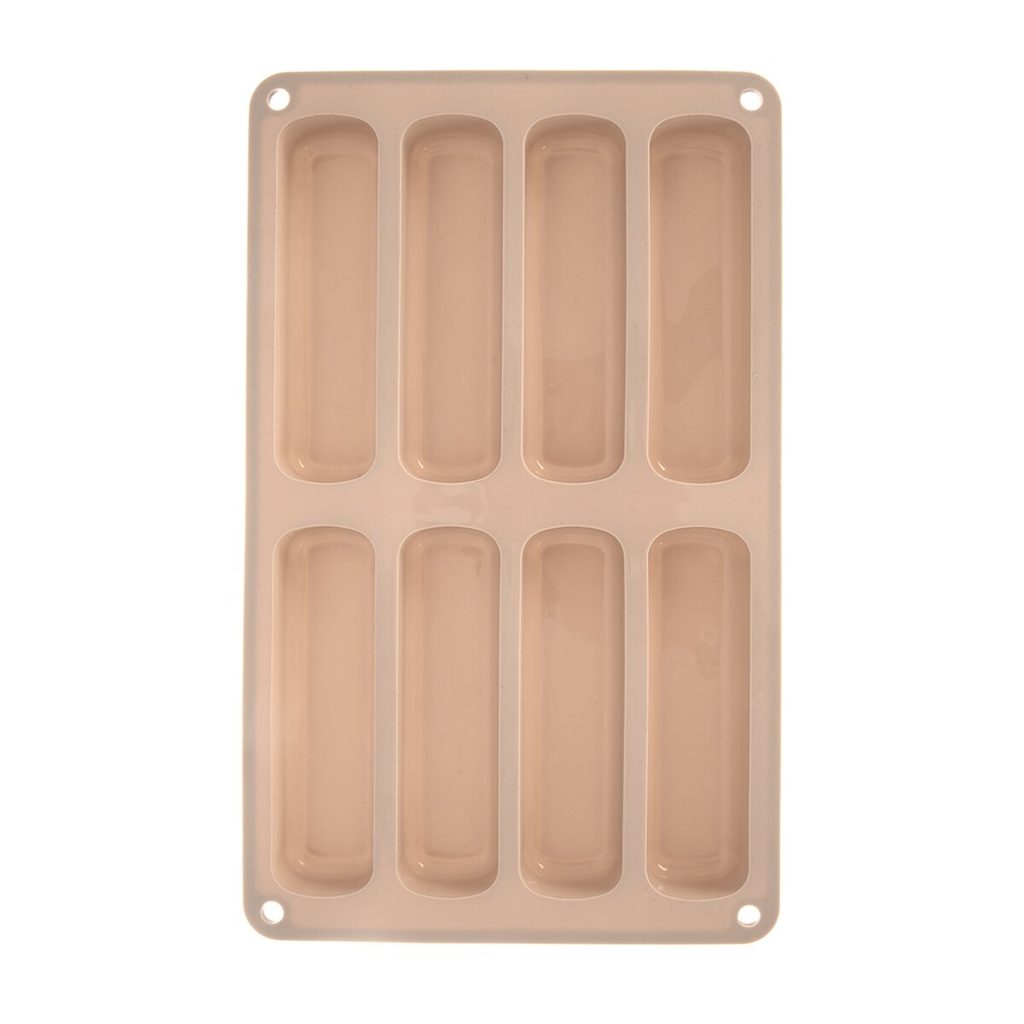 Silikonová forma na výrobu cukrářských piškotů Vám pomůže vytvořit krásné sladké i slané dezerty, domácí müsli tyčinky, zákusky a francouzské deserty typu éclairs. Můžete vytvořit nepečené i čokoládové zákusky, stejně dobře v ní ale tyto tvary můžete upéci z piškotového nebo litého těsta. Materiál: silikon. 8 tvarů. Snáší vysoké teploty (od -40 °C do +200 °C), nepřejímá chutě ani vůně z použitých potravin. Vhodná do myčky na nádobí, MVT, chladničky, mrazničky i trouby. Rozměry: 28x17x2 cm, jednotlivá formička 11,5x3,2 cm. Pozor na poškození formy ostrými předměty.