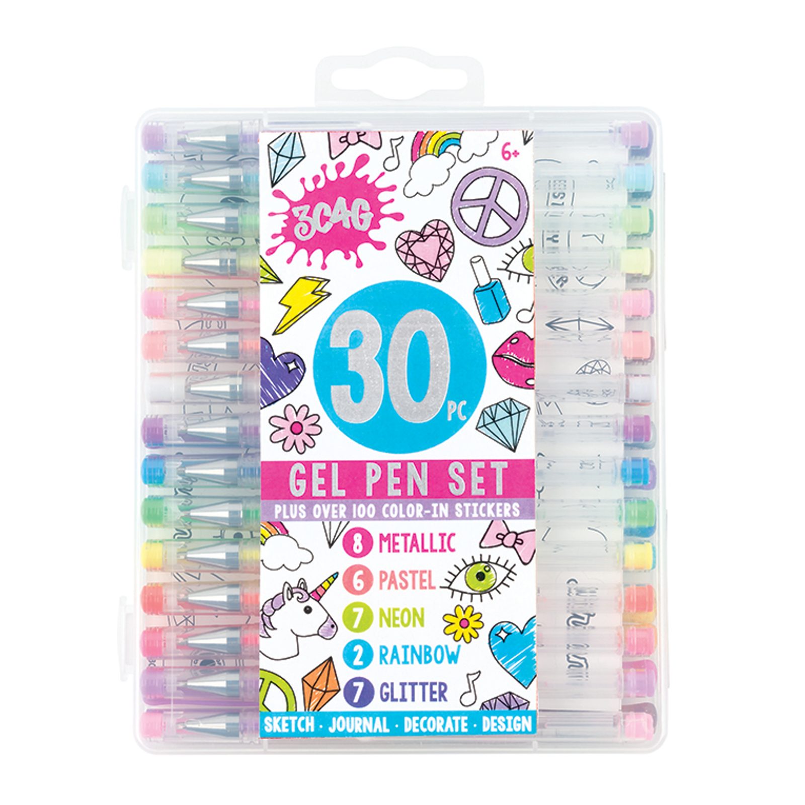 Balení obsahuje 30 gelových per. 8 metalických, 6 pastelových, 7 neonových, 2 duhové, 7 třpytivých a 100 samolepek, které si sami vybarvíte! Vhodné od 6 let.