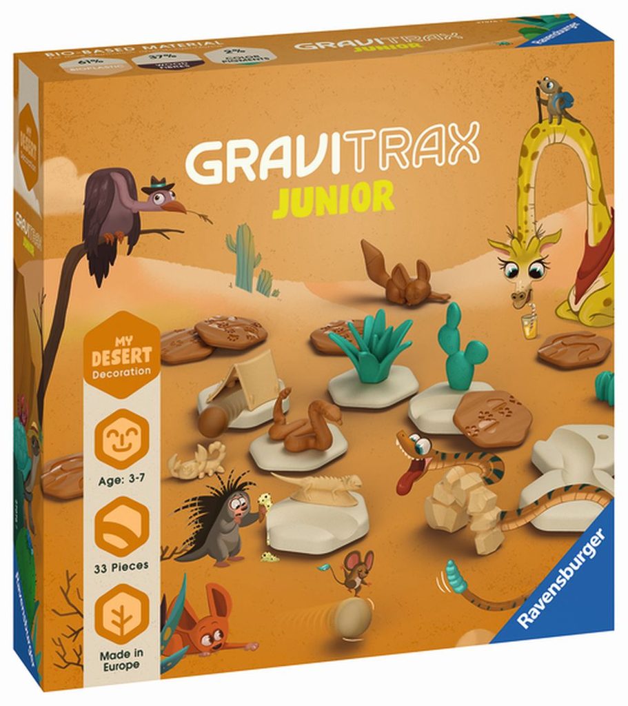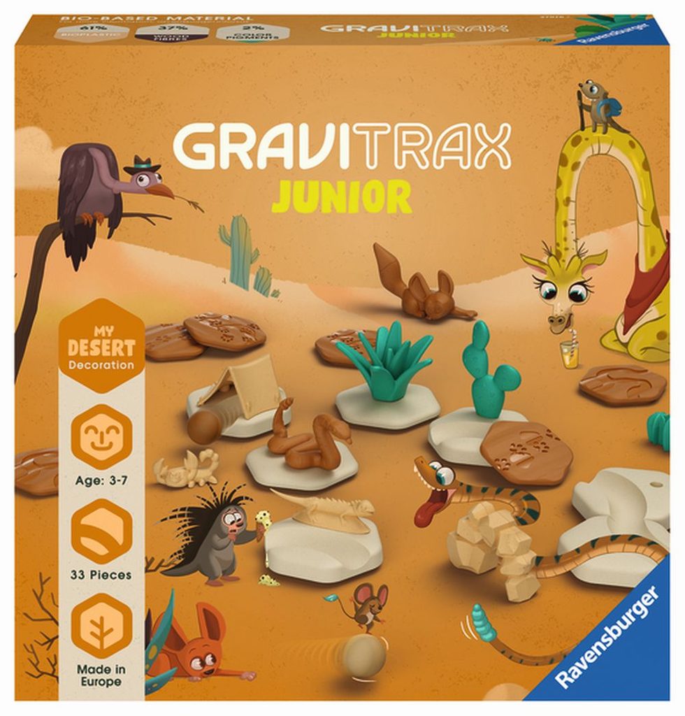GraviTrax Junior je interaktivní systém kuličkové dráhy pro děti od 3 let. Ti nejmenší si staví své vlastní světy z kuličkových drah, které lze podle libosti zdobit a vytvářet tak jednotlivé tematické světy. Děti si tak při kreativním stavění užijí mnoho zábavy. Chlapci a dívky si mohou stavět své vlastní světy z kuličkových drah, které lze podle libosti zdobit a vytvářet tak jednotlivé tematické světy. Díky tomuto rozšíření Poušť, které obsahuje nejrůznější pouštní prvky a postavičky zvířat děti zažijí svět pouště zblízka. Všechny stavební a dekorační součásti jsou vyrobeny z dřevěného bioplastu. GraviTrax Junior je interaktivní systém kuličkové dráhy pro děti od 3 let. Ti nejmenší si staví své vlastní světy z kuličkových drah, které lze podle libosti zdobit a vytvářet tak jednotlivé tematické světy. Děti si tak při kreativním stavění užijí mnoho zábavy. Chlapci a dívky si mohou stavět své vlastní světy z kuličkových drah, které lze podle libosti zdobit a vytvářet tak jednotlivé tematické světy. Díky tomuto rozšíření Poušť, které obsahuje nejrůznější pouštní prvky a postavičky zvířat děti zažijí svět pouště zblízka. Všechny stavební a dekorační součásti jsou vyrobeny z dřevěného bioplastu.