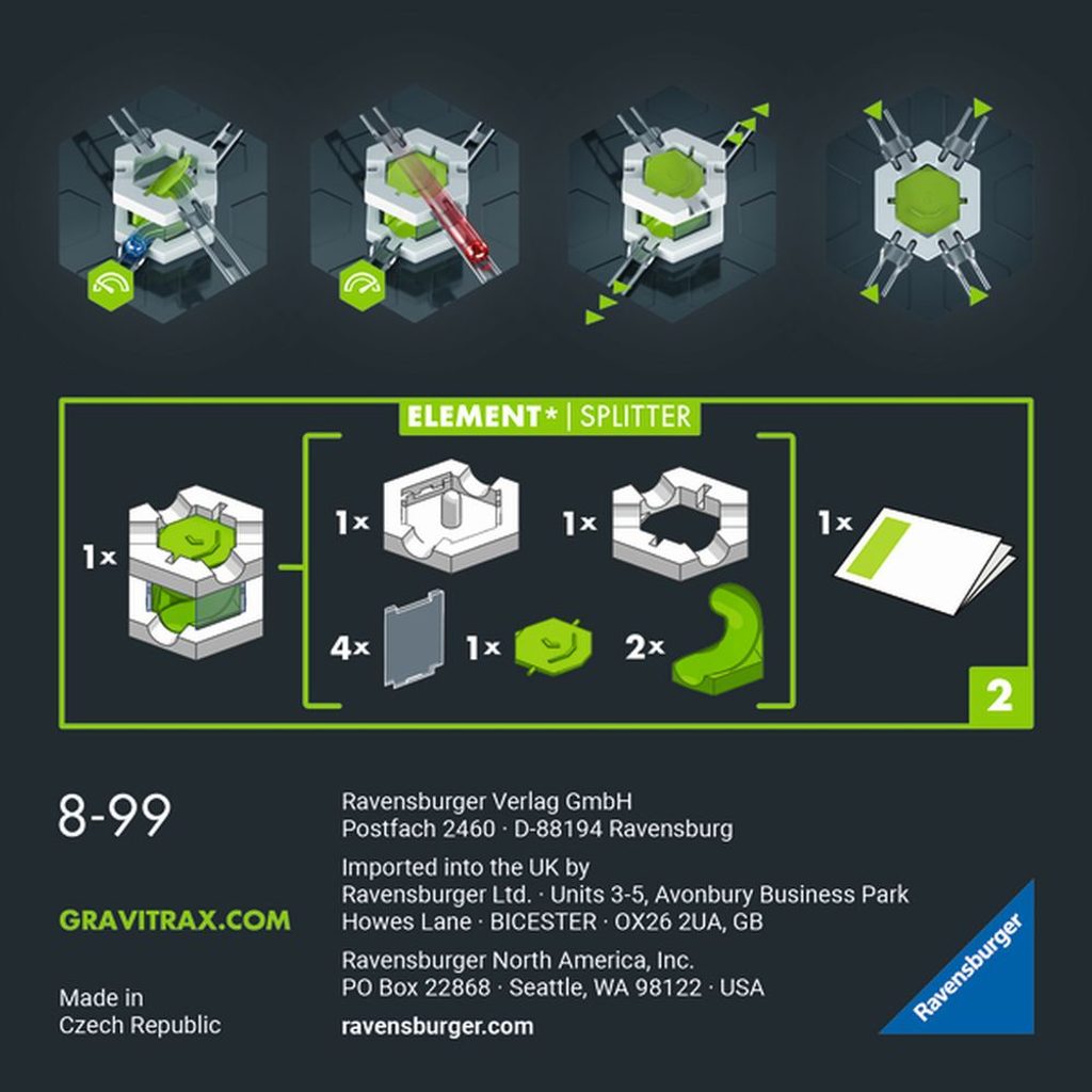 Doražte do cíle ještě rychleji! Splitter pustí kuličku o patro níž a dodá jí na vaší dráze novou energii. Díky propojení jednotlivých pater získá vaše dráha na dynamičnosti.