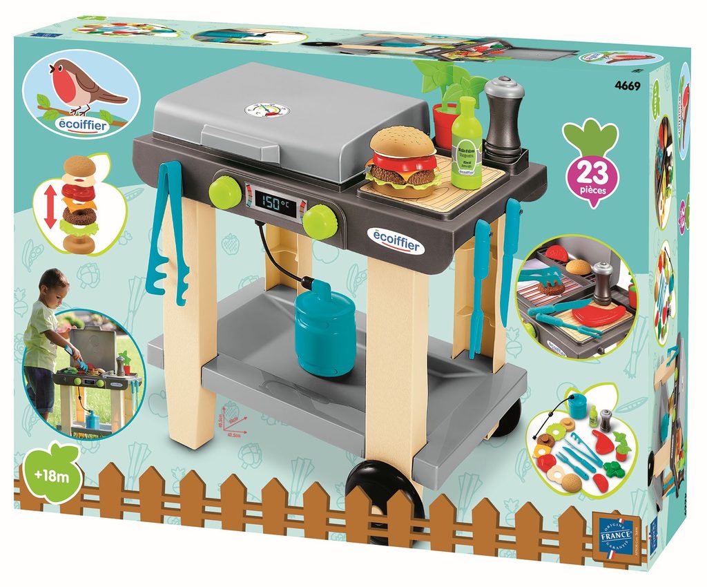 Plynový gril s víkem, stolečkem na kolečkách a spoustou příslušenství: makety potravin, plynová láhev, mlýnek se solí, olivový olej, bazalka v květináči a nádobí potřebné k vaření a krájení. Rozměry: 43,5 x 59 x 28 cm (otevřený), 43,5 x 40,5 x 28 cm (zavřený).