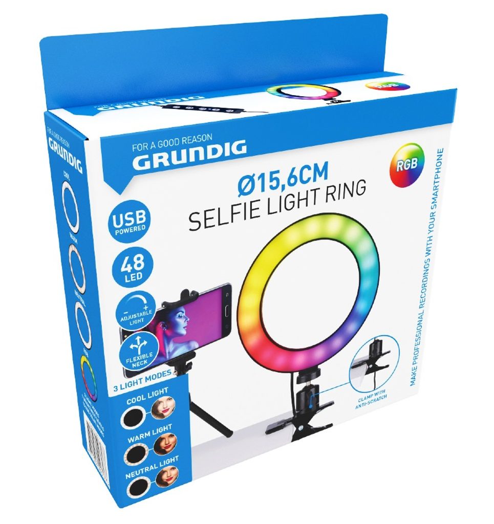 GRUNDIG Kruhové světlo RING LIGHT 48 LED RGB ED-249617 S touto kruhovou lampou od Grundig si můžete vybrat ze všech barev duhy pro vaše video, fotografii nebo Tiktok! Kruhové světlo je dodáváno s klipem, který můžete snadno připevnit na stůl, stůl nebo jiný rovný povrch. Díky tomu je selfie světlo ideální pro použití na mnoha různých místech. Díky ohebnému krku můžete s kruhovou lampou jít jakýmkoli směrem (doslova)! Kruhová lampa je vybavena 48 LED diodami a celou řadou barev. Můžete si také vybrat mezi studeným, teplým nebo neutrálním světlem. Upravte si prstencové světlo podle svých představ díky přiloženému dálkovému ovladači, který je připevněn ke světlu.Technické údaje Kruhové světlo GrundigPrůměr: ?16 CM48 LED diodPružný krkPřizpůsobitelné barvy, jas a teploS klipem pro různé možnosti montáže