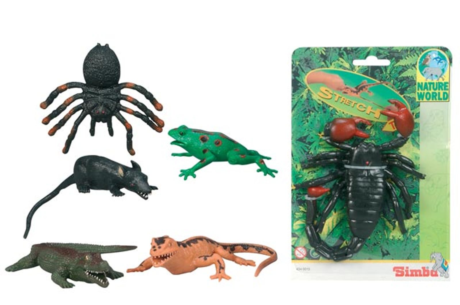 Gumová strečová zvířata. Škorpión, pavouk, krysa, krokodýl, ještěrka a žába. Délka: 14 cm.